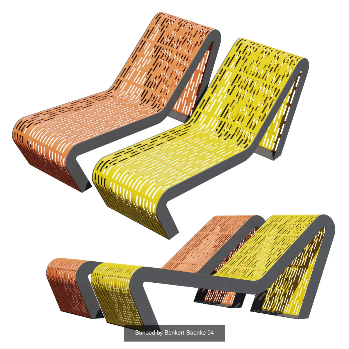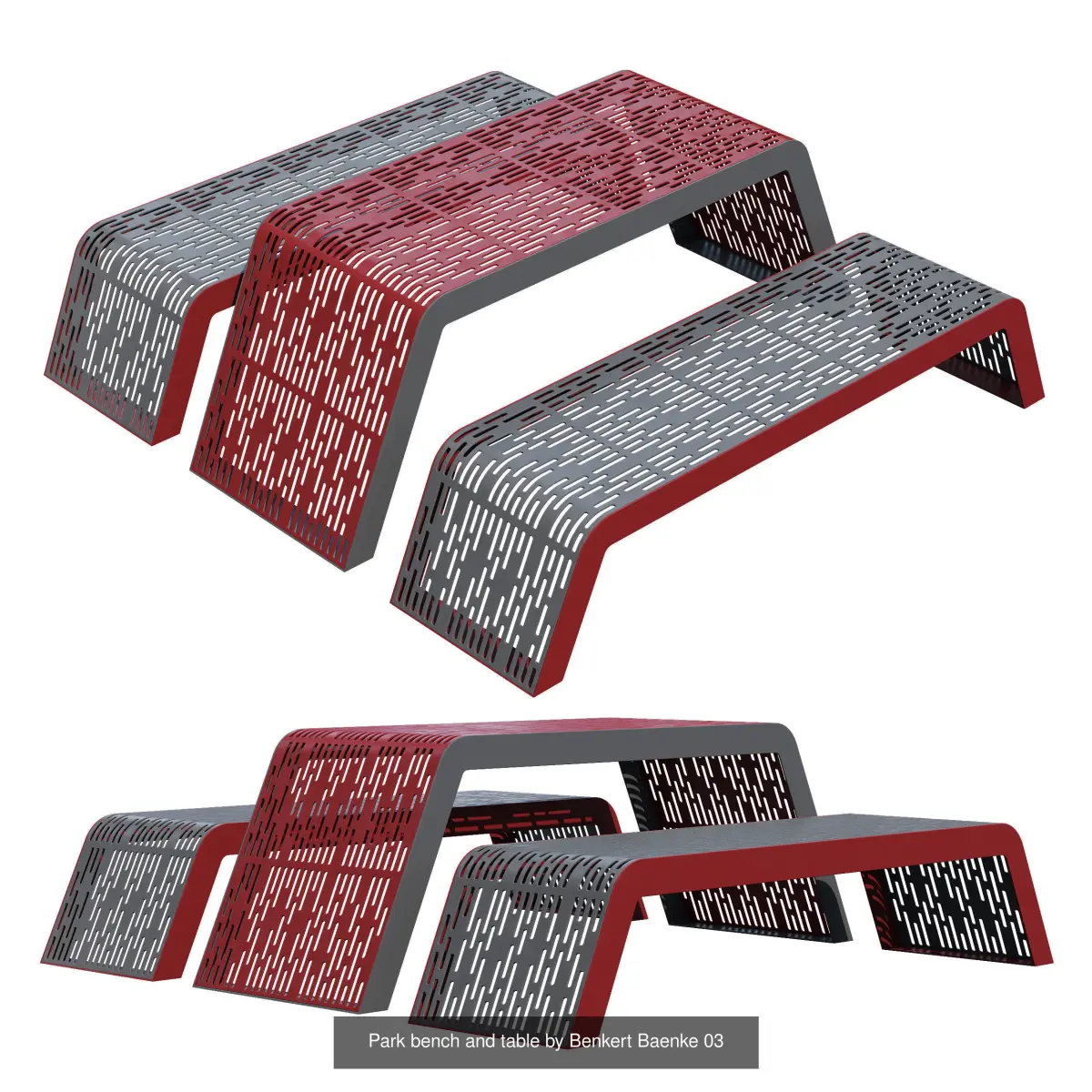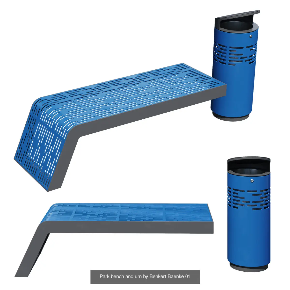 A set of bright, stylish and modern street landscaping from Benkert Baenke that will decorate the area in your visualizations.11 objectstraps with a back, benches without a back,trash cans, table, cabin, outdoor chair