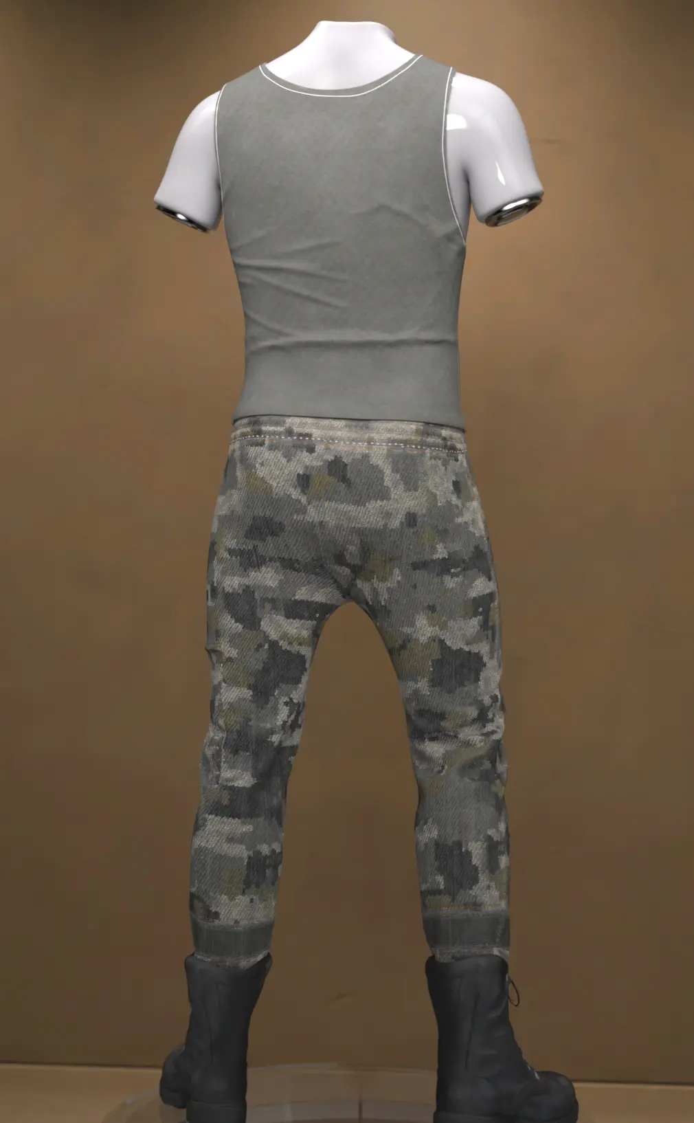 The set includes a simple but sturdy Tank Top, detailed Camouflage Pants, and heavy-duty Outdoor Boots, giving your renders an authentic, readiness feel.