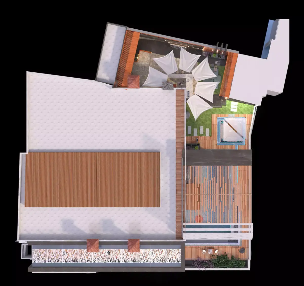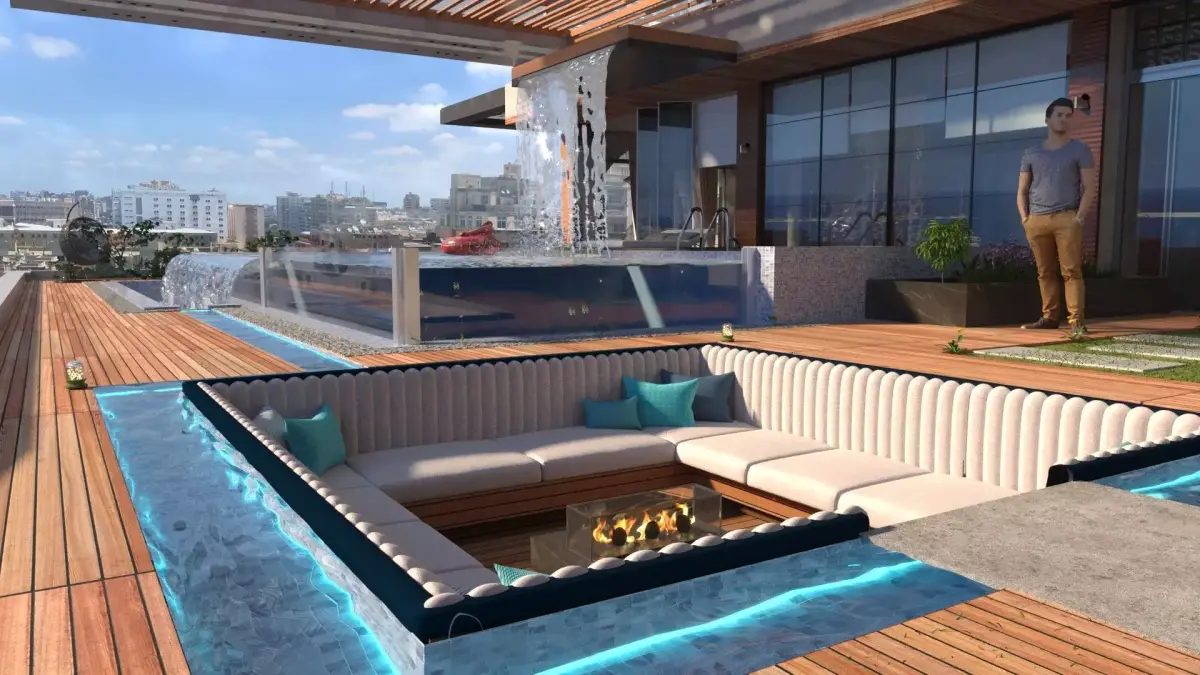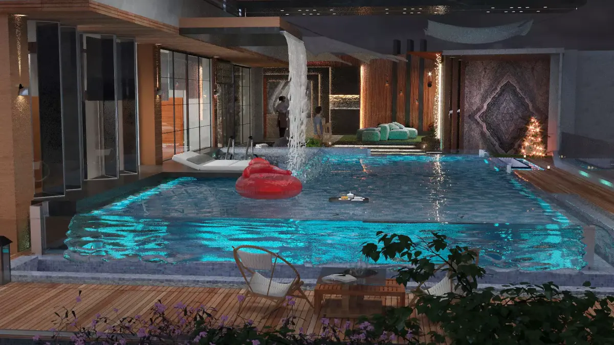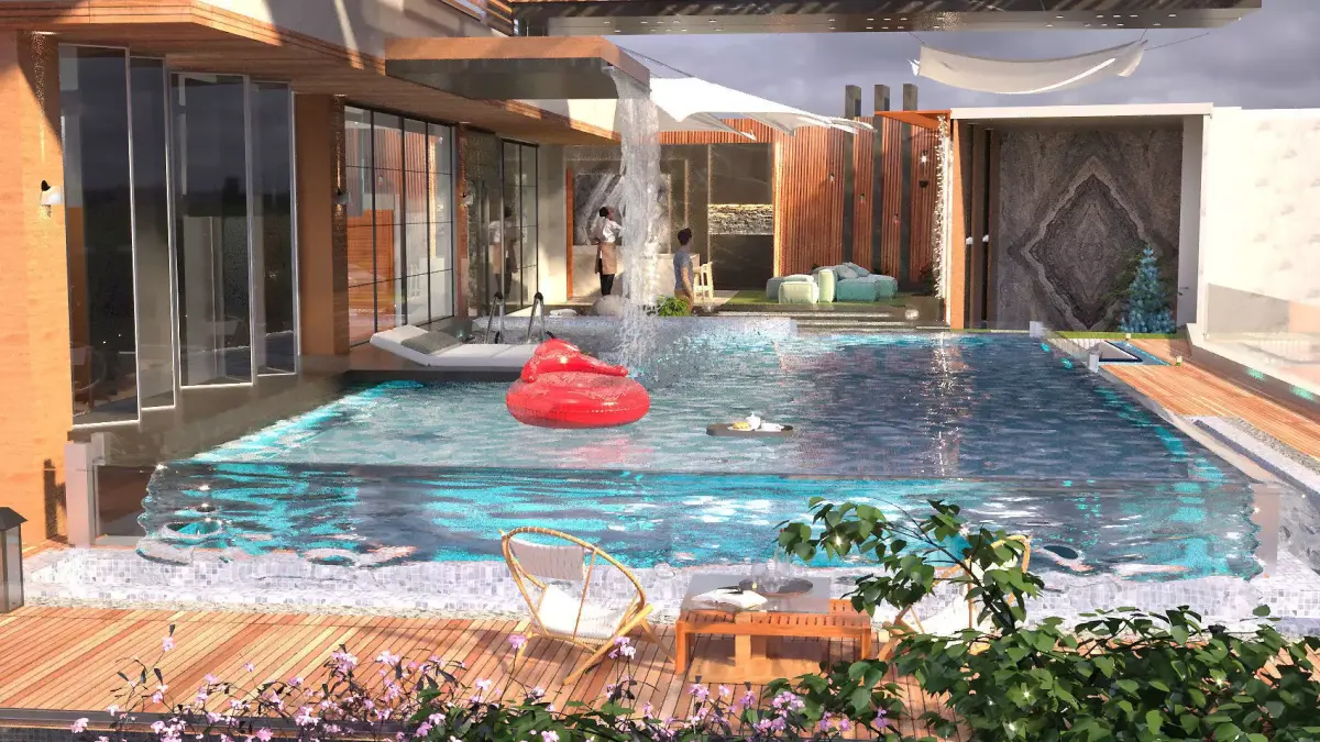 outdoor design , include swimming pool , seating area, kitchen, cozy area and landscape ,create by using 3dmax2023 , corona render , lightmix