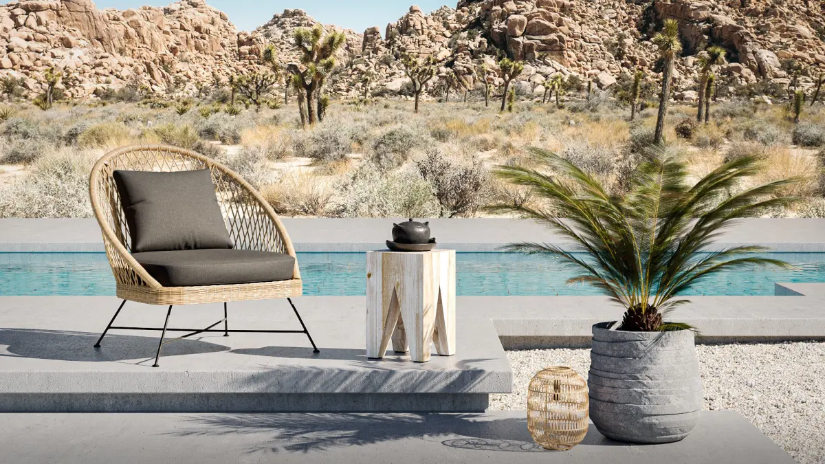 This outdoor set is inspired by Tropical and Bohemian design. This set of furniture matches the typical oasis type arid environment.