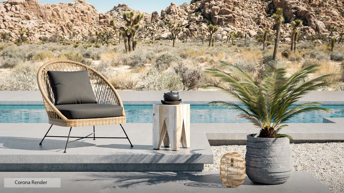 You can use the scene for personal and editorial work - please note that the furniture in this scene has an Editorial License and may require additional licensing from the manufacturers for commercial use (Article Furniture). If you intend on replacing the furniture you may use the scene, set and lighting royalty free for any purpose. You can learn from the scene; how the lights are set up, cameras, settings, tone mapping, materials, textures and post production files all included. All lights are set to default settings with an Output adjustment for the Environment light to darken the shadows from the sun to match the background plate. All cameras/exposure settings are set to real world values for parity between Vray and Corona render engines. The only materials that have been adjusted differently in the Corona version is the leaves on the Palm and the Pool Water - as translucency / fog values differ between engines. Ground rocks/gravel scattered with Forest-Pro.