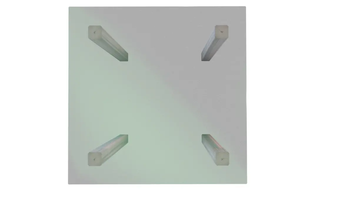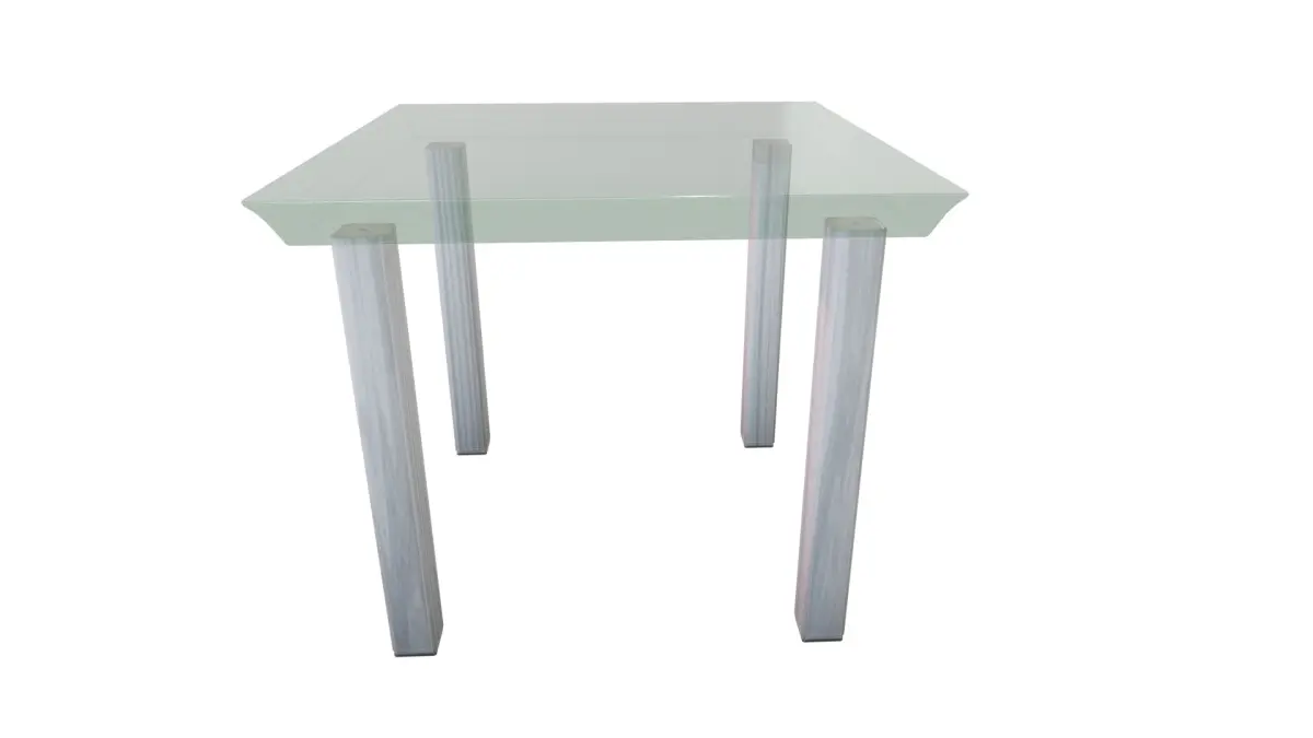 This contemporary outdoor table exudes modern charm. It has a greenish glass top supported by painted wooden legs of light gray hue. It has black rubber grips at the bottom of the legs for additional grip on the surface it is placed on. The table has a square shape with rounded corners and a textured surface, combining style and practicality for outdoor gatherings.
