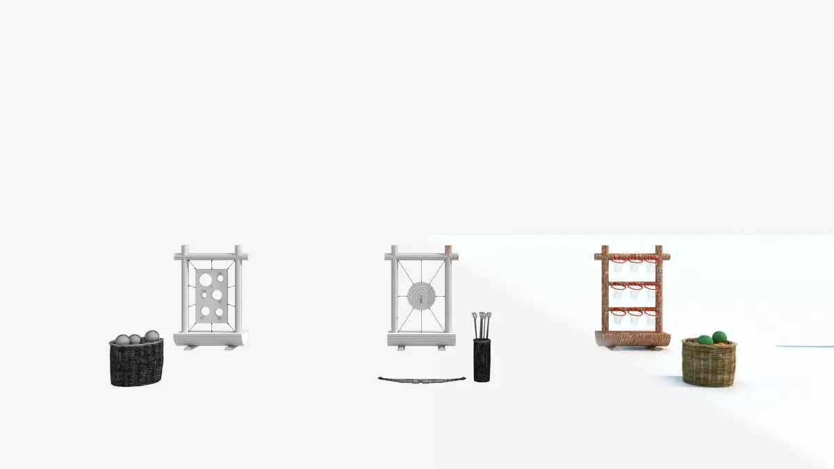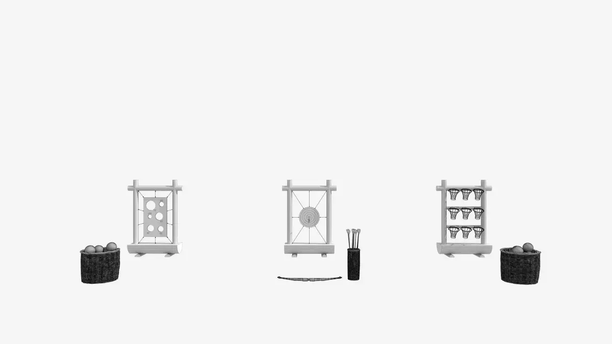 This toy has a core style of natural light fun, using a combination of imitation wood texture frame and woven accessories, suitable for outdoor scenes such as courtyards and camping, integrating three types of interactive gameplay, balancing leisure and fun:Throwing gameplay module: including dual configurations of hole target plate+fun nine grid target, paired with soft throwing balls, achieving low threshold leisure interaction through throwing into the hole and target grid scoring; Shooting gameplay module: Two forms of traditional arrow targets and slingshot animal targets have been designed. The arrow target is compatible with safety suction cup arrows, while the slingshot target targets three-dimensional small ornaments, retaining the immersive shooting experience while reducing risks through safety props; Storage integrated design: The matching woven basket can store accessories such as throwing balls and arrows. The toy frame comes with a target switching structure, which allows for quick switching of gameplay without additional assembly. The overall design covers different scenarios such as single person practice and multiplayer competition while ensuring safety, making the outdoor leisure experience more rich and relaxed.Model making software: 3ds Max 2014
