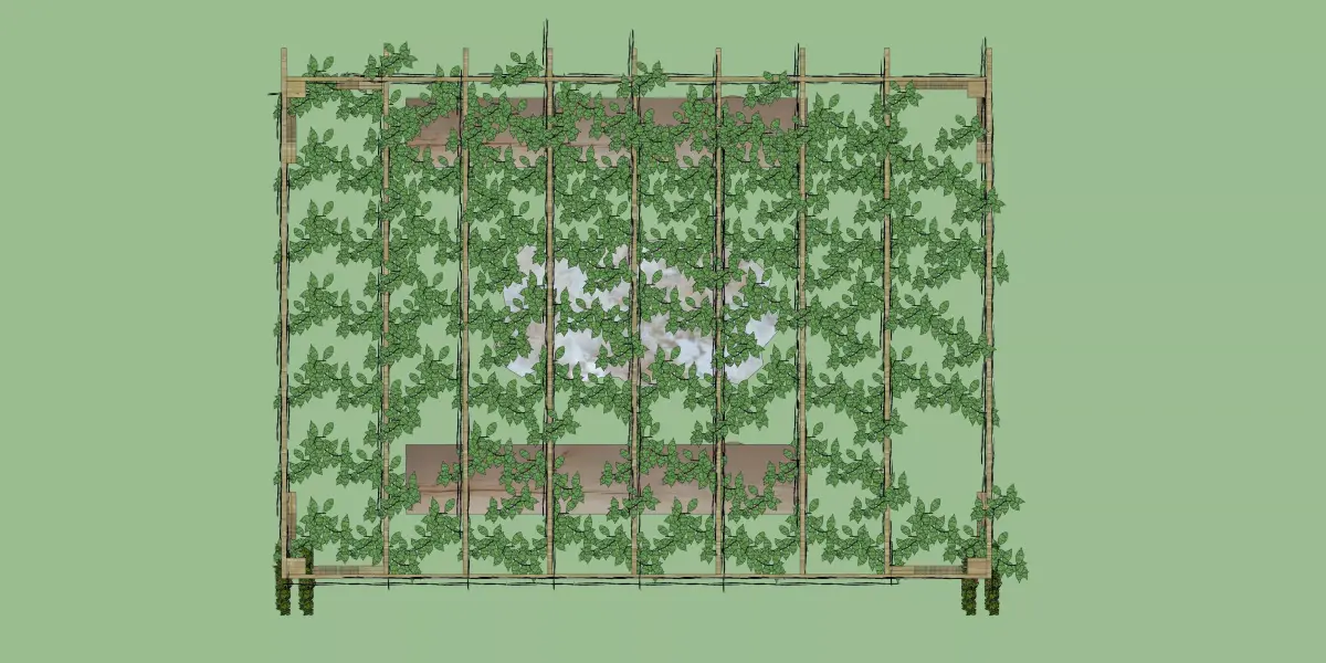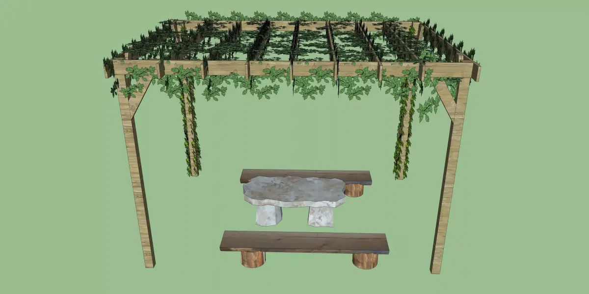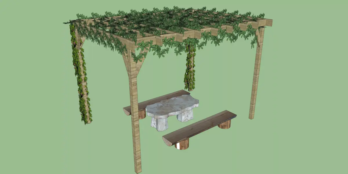 This 3D model features a charming outdoor pergola made from natural wood with an intricate vine-covered roof, providing a perfect space for relaxation and entertainment. The pergola is complemented by a stone center table and wooden benches on either side, offering ample seating for outdoor gatherings. The vines hanging from the pergola add a touch of greenery, making it ideal for gardens, patios, or courtyards. The model is designed to blend seamlessly with nature while providing a stylish and comfortable outdoor seating arrangement.