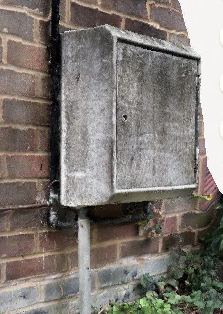 The surface texture of the electrical box is captured with precision, including subtle imperfections, scratches, and wear marks, giving it an authentic look. The model's materials are carefully calibrated to replicate the box's metallic or plastic composition, depending on the actual material used in the real-world counterpart.
