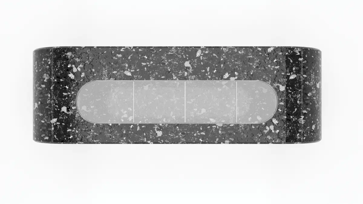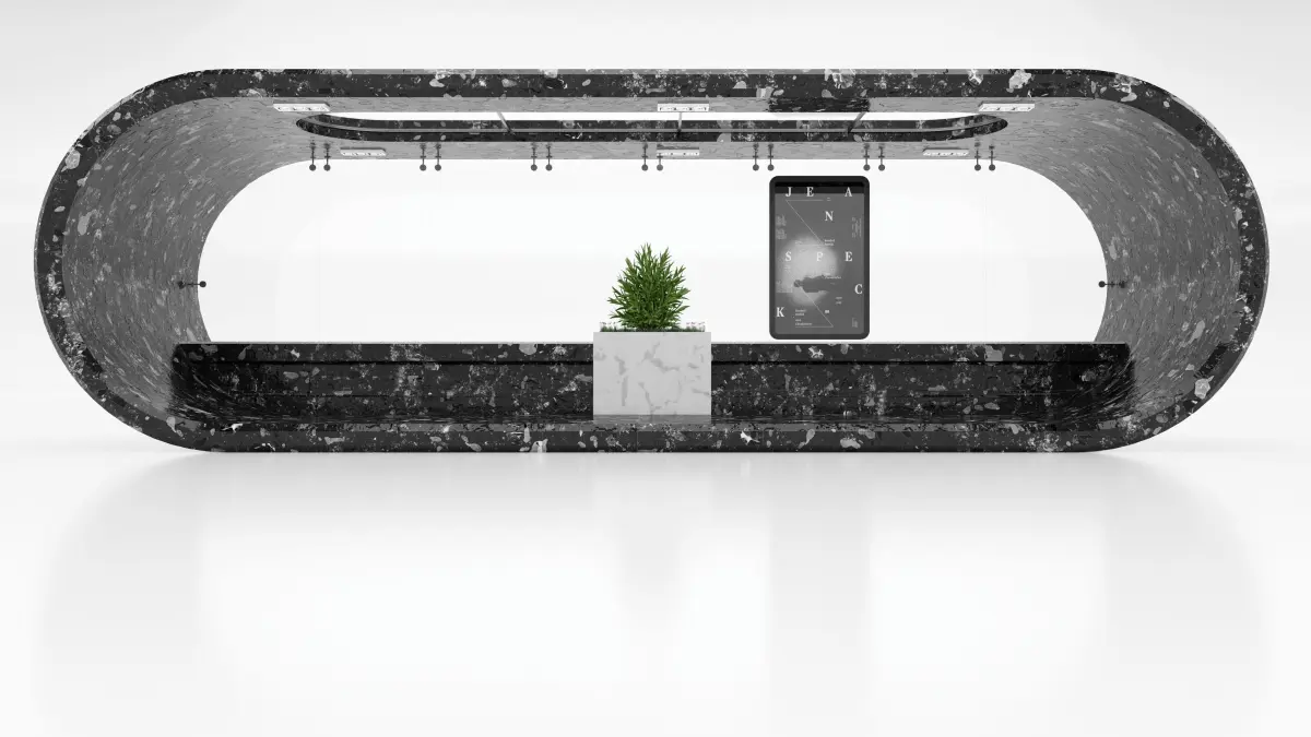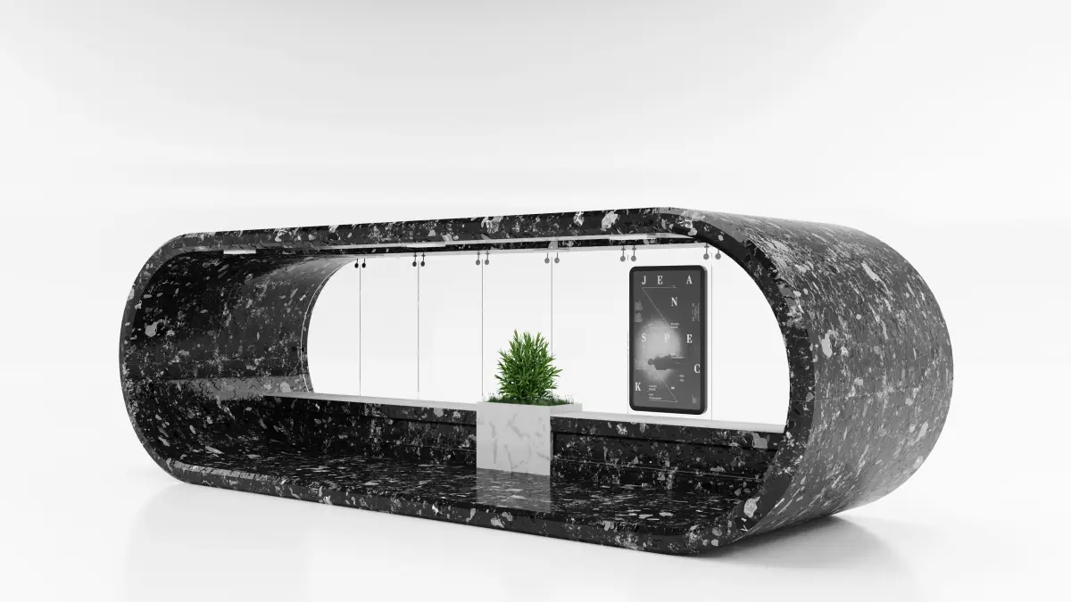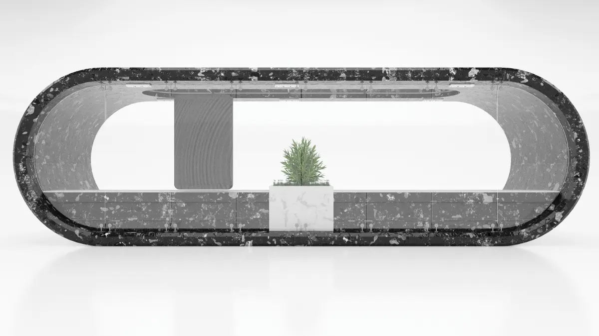 A stopping complex in the form of an oval, the color scheme of which resembles the unity and struggle of opposites, white and black, yin and yang.The complex looks bright, inside it there are comfortable benches for passengers of public transport, which are shared by a beautiful flowerpot with dwarf shrubs and lawn grass. This refreshes the complex and gives a good mood, distracts from negative thoughts, pleases the eye.The roof of the complex additionally gives a lot of daylight sunlight due to the built-in, figuratively speaking, strong glass windows.The stop complex looks bright, creates an inner cosiness and a warm atmosphere. And it will decorate any city or town.