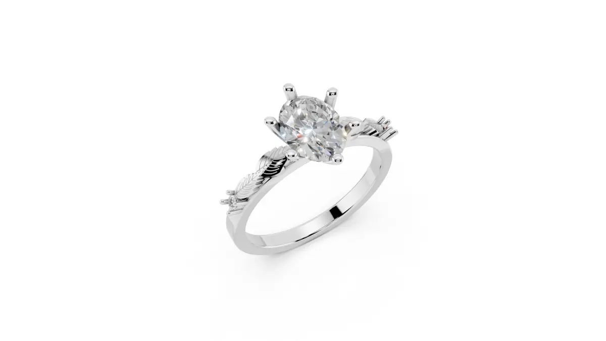 his 3D model showcases a stunning oval diamond ring, featuring a prominent oval center stone surrounded by a four-prong setting and accompanied by two smaller round diamonds on the band. The ring is designed with a simple yet elegant band that complements the center stone, creating a sophisticated and luxurious piece of jewelry.