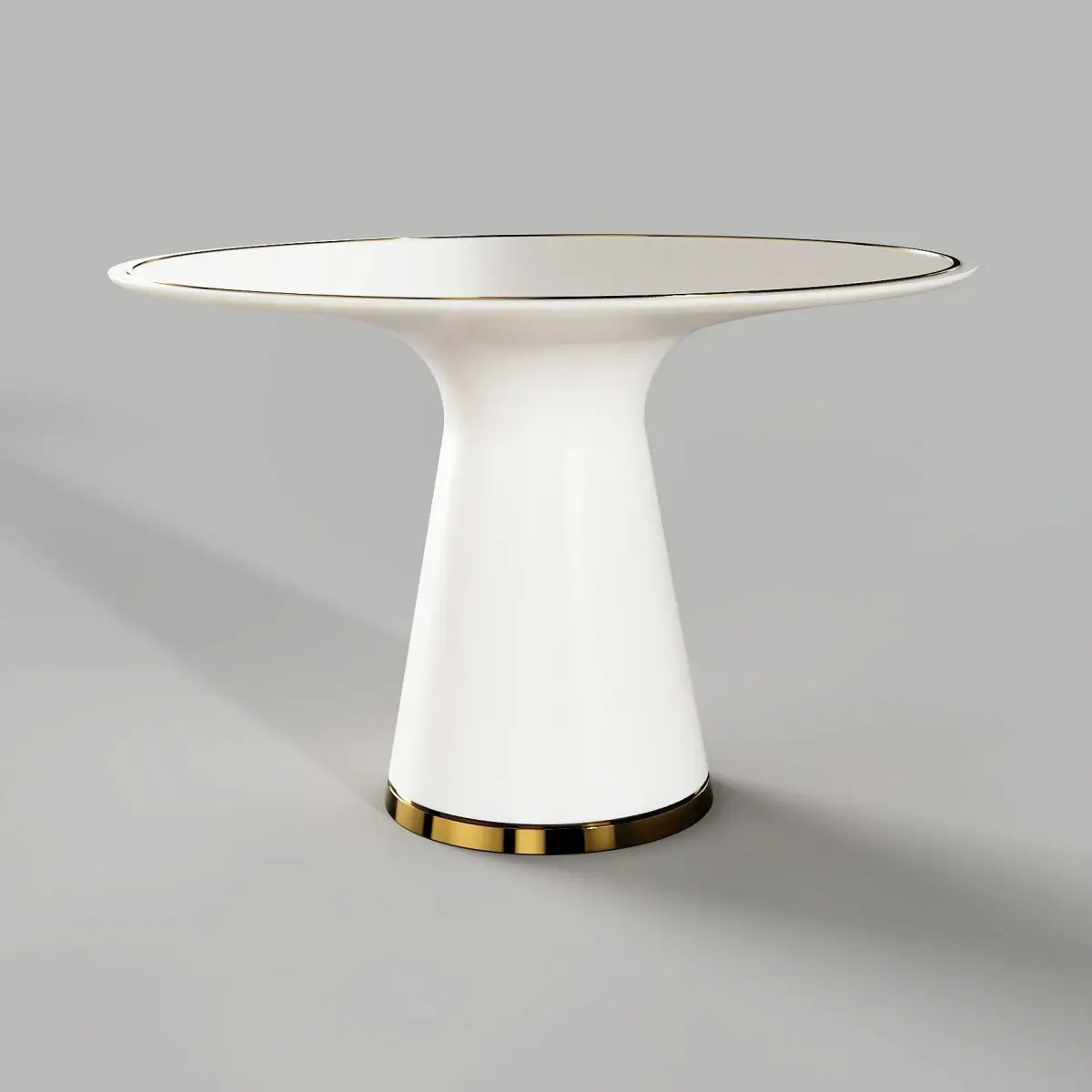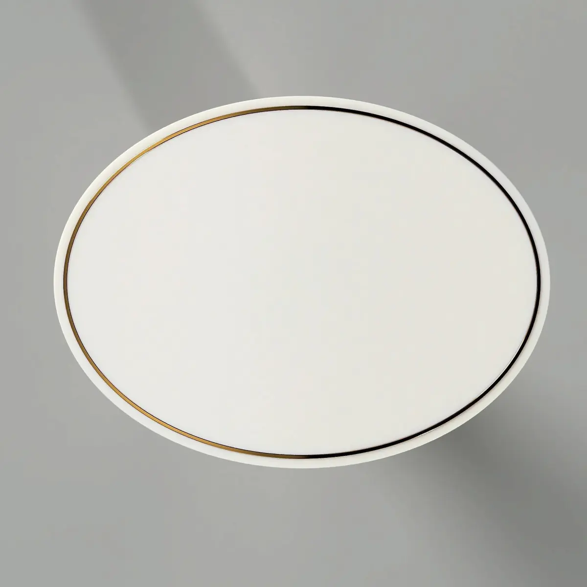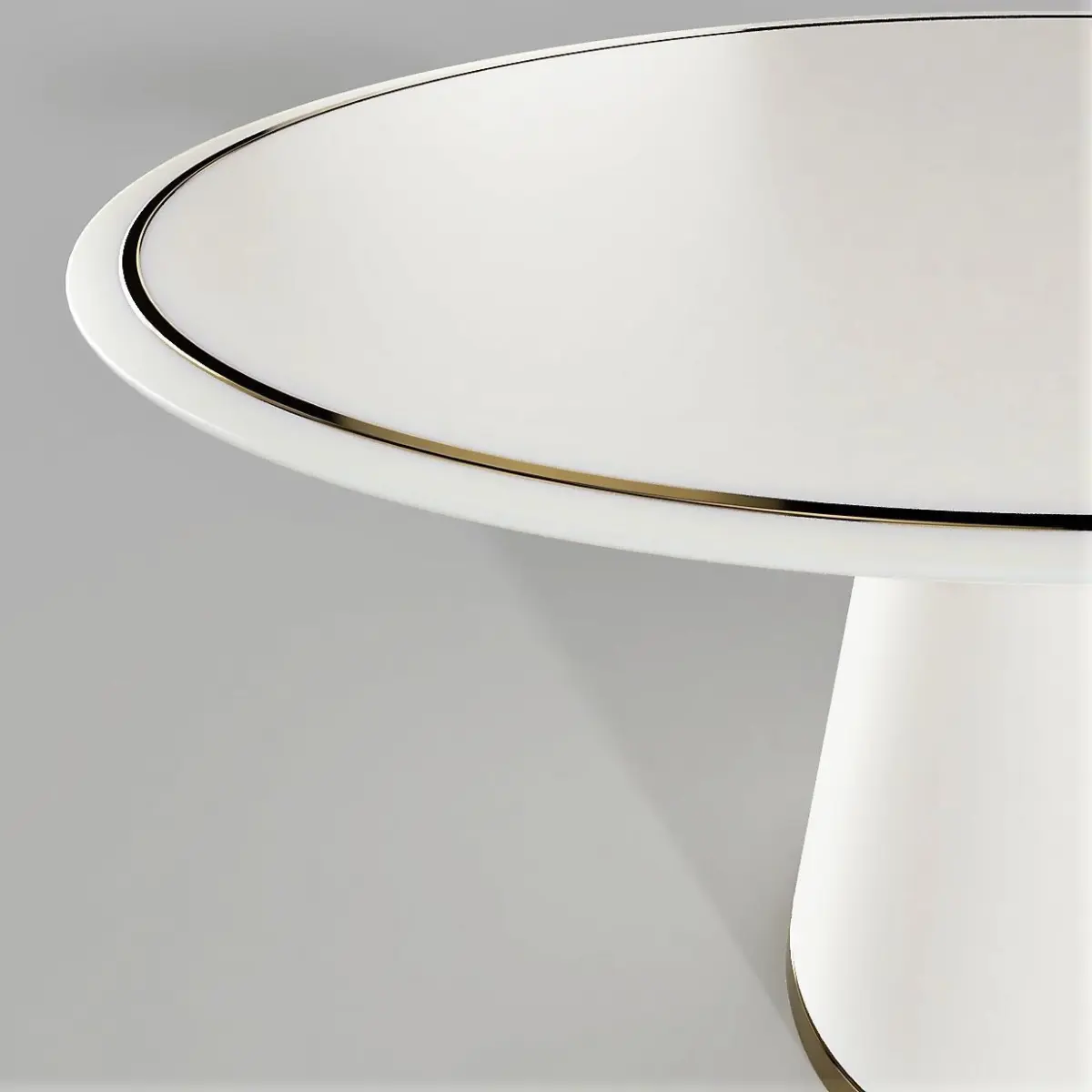 Oval white lacquered Table with a protruding brass insert on the top.Round base.Dimensions: Length 1000 mm, depth 750 mm, height 650 mm, round base diameter 400 mm.