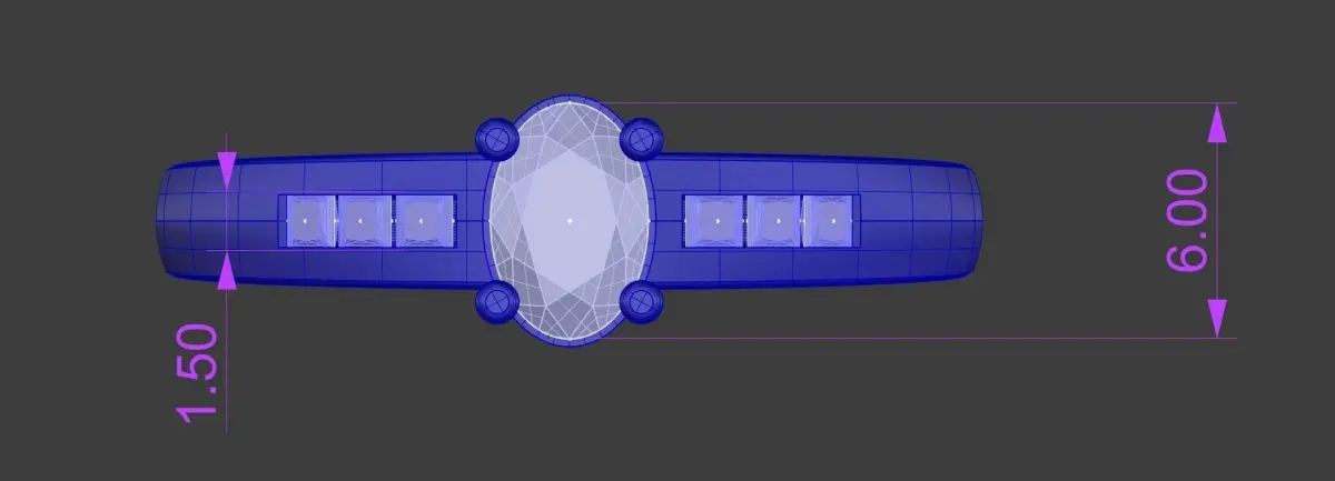 Size 7 oval and princess cut ring model up for sale. Features one 6mm oval and six 1.5mm princess cut stones. All other dimensions are in the last two pictures.