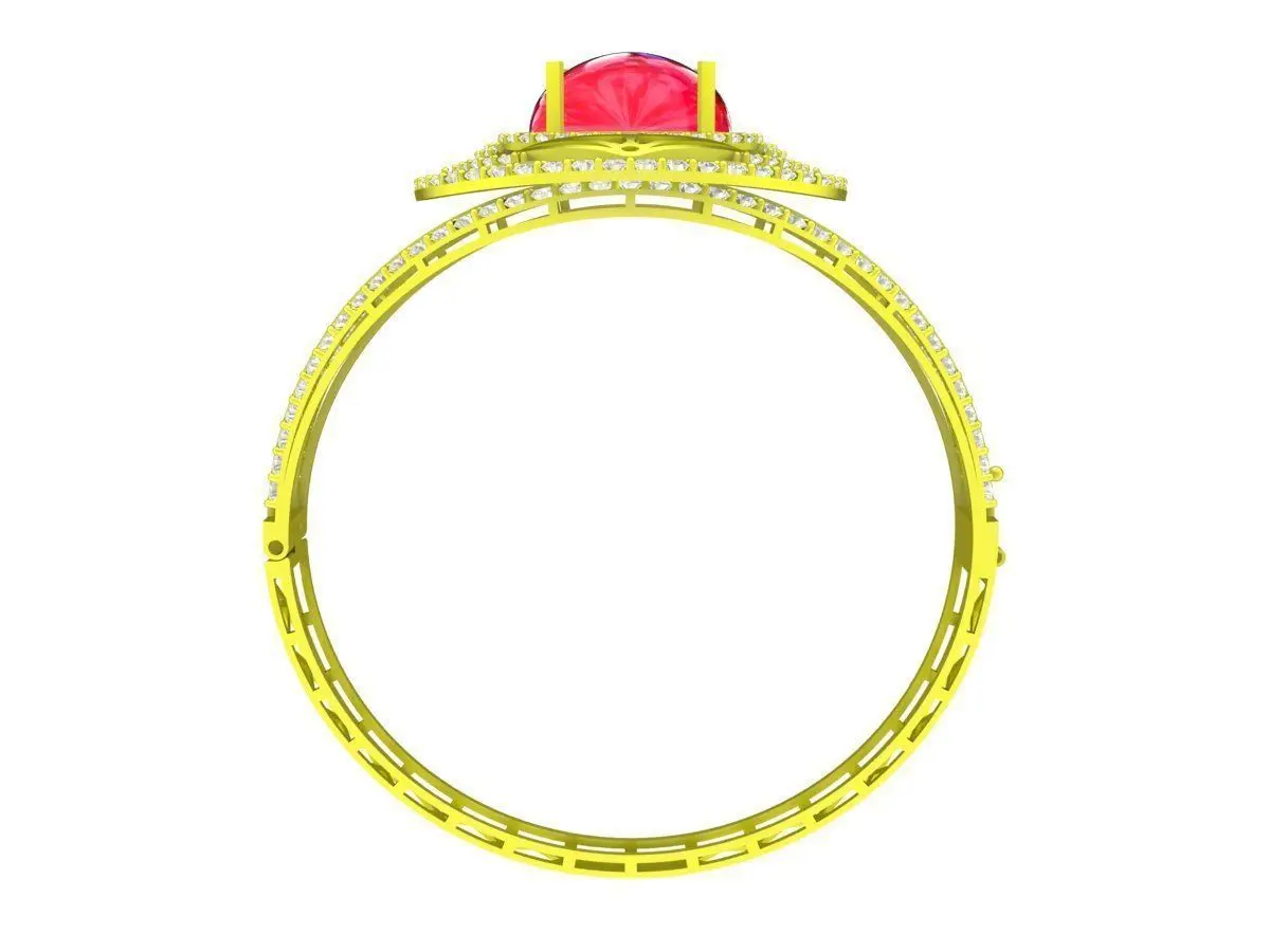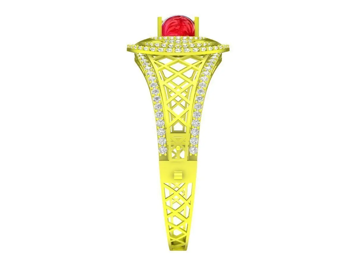 This 3D jewelry model features an elegant oval halo ring design with a raised center stone setting and a decorative lattice-style band. The oval centerpiece is surrounded by a halo of small stones, enhancing brilliance and creating a balanced, luxurious appearance.