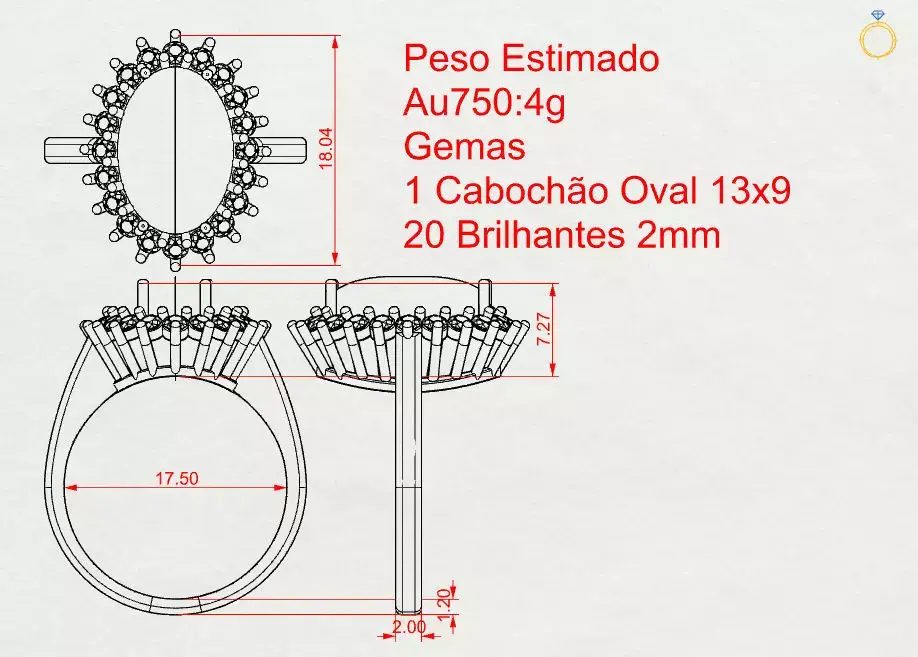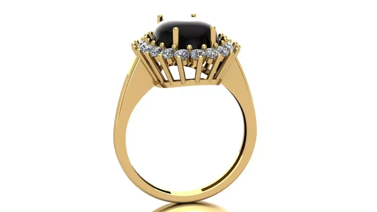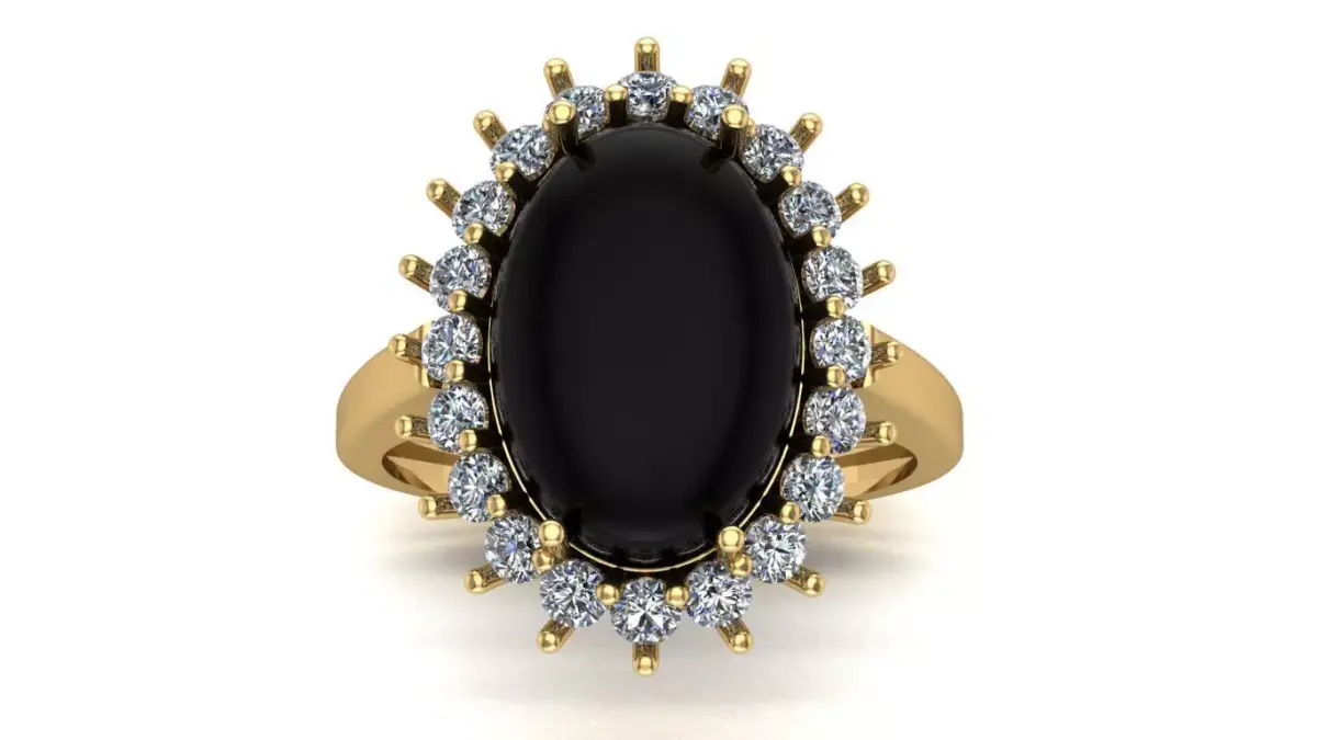Oval Onyx Ring with Brilliant Halo3D design of a ring with an estimated weight of approximately 4.0 g in 18K gold (Au750). The piece features one oval cabochon-cut onyx measuring 13 × 9 mm, surrounded by 20 brilliant-cut diamonds of 2.0 mm. The halo arrangement enhances the contrast between the deep black onyx and the sparkle of the diamonds, creating a sophisticated and timeless look. Dimensions are shown in the image (in millimeters).