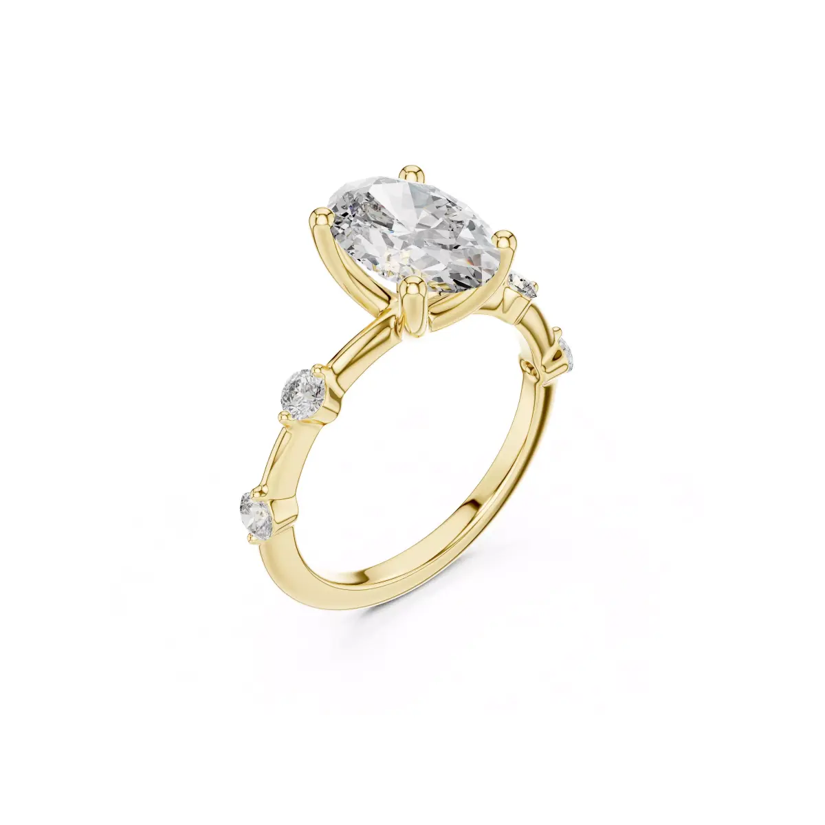 The oval brilliant center diamond is secured in a classic four-prong setting, elevated to maximize brilliance and light performance. The band features subtle spaced round diamonds set in minimal bezels/prongs, creating a contemporary “floating stone” effect that adds sparkle without overpowering the center stone.