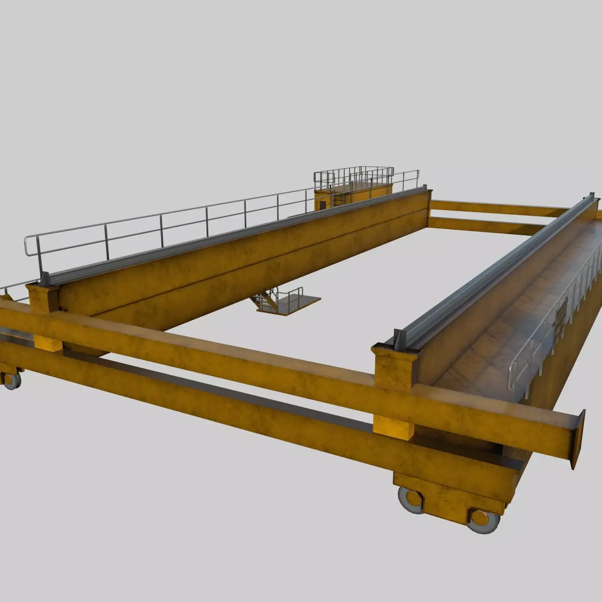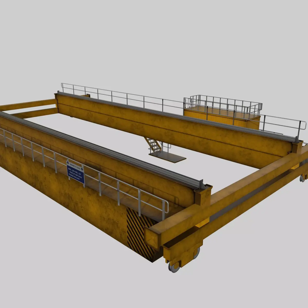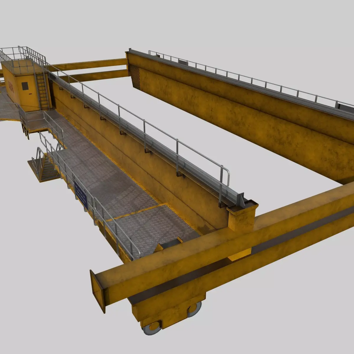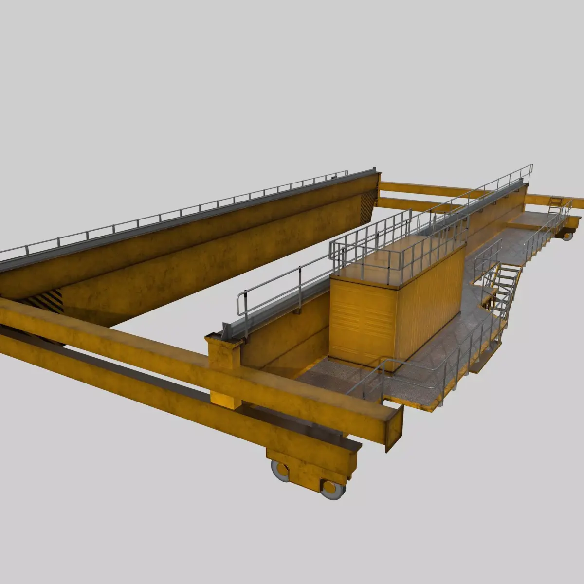 This model represents a bridge-style overhead crane system with dual girders, walkway platforms, safety railings, operator cabin, and support wheels, ideal for VR/AR training simulations, plant visualization, or industrial digital twins.