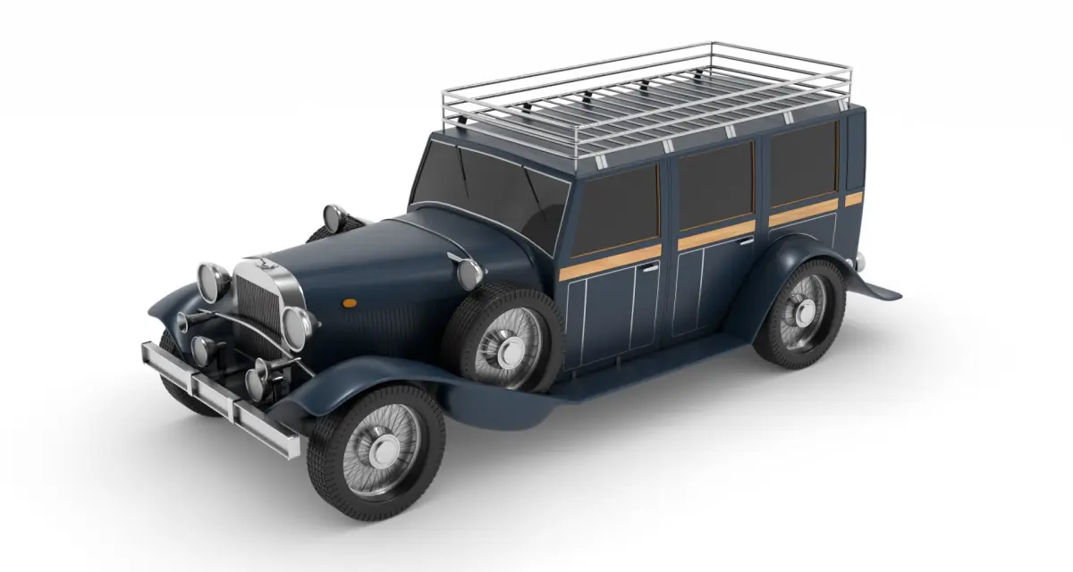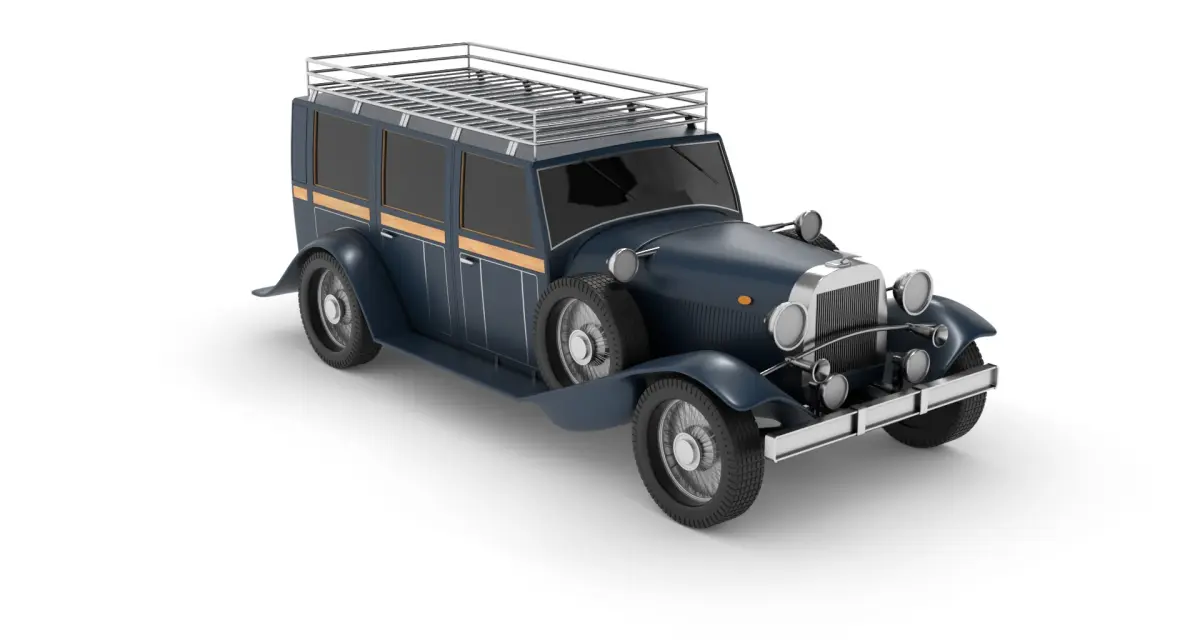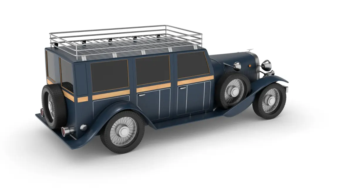 An iconic overland vehicle from the historical timeline, perfect for civilian adventurers. This car showcases a sleek and aerodynamic design in a striking dark blue hue, complete with chrome accents and a roof rack for extra storage. The interior exudes luxury with plush leather seats and wood paneling, embodying both style and functionality for long journeys off the beaten path.