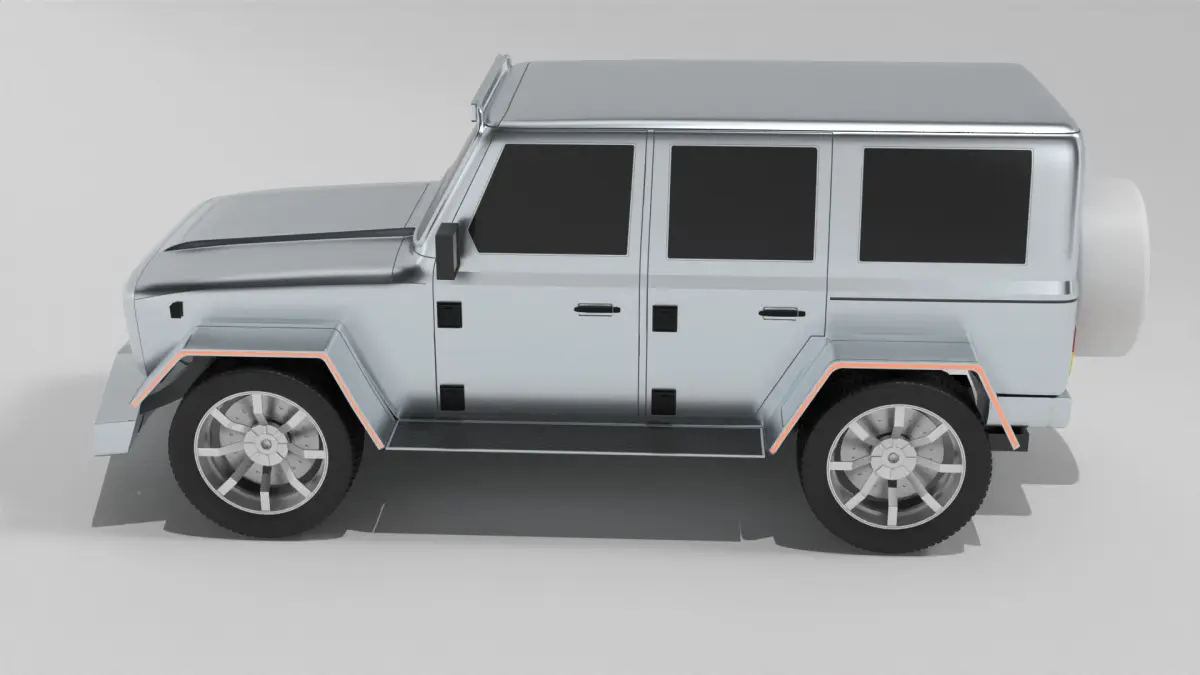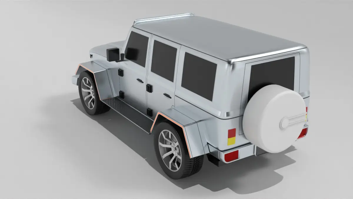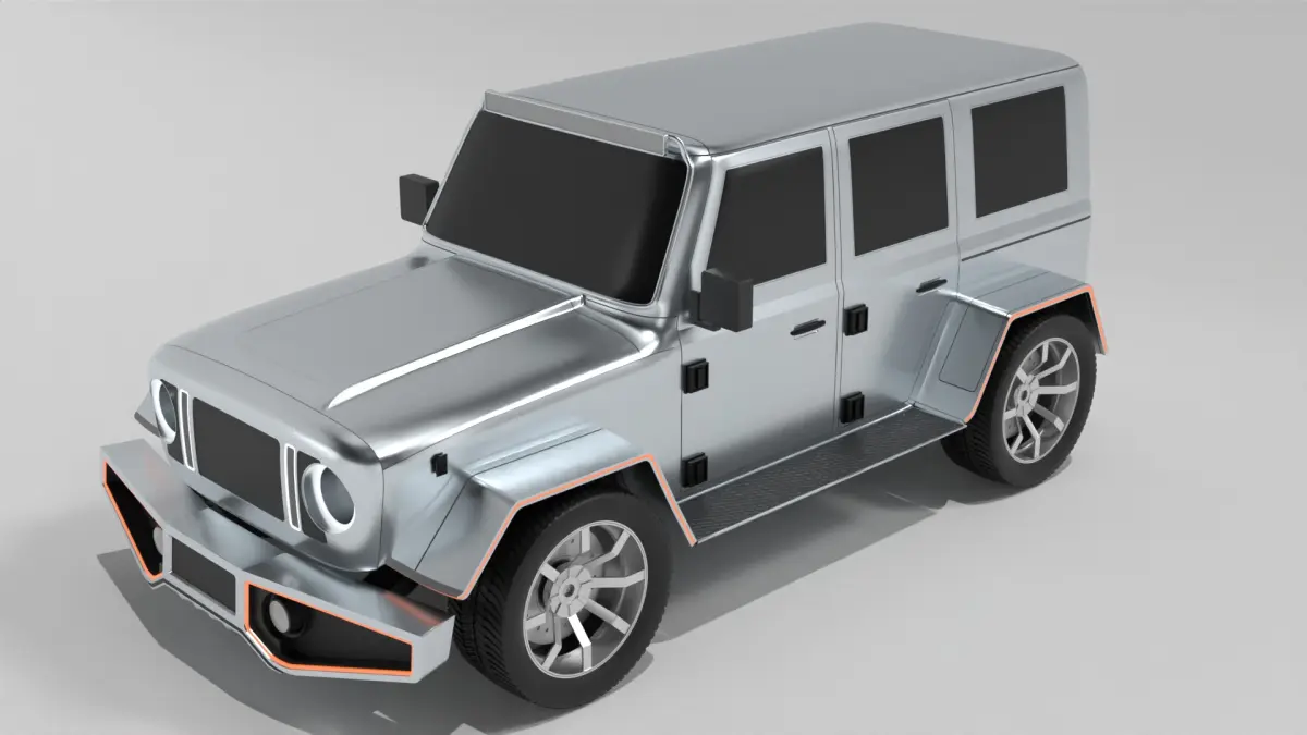 An off-road vehicle tailored for civilian exploration, characterized by its sleek and aerodynamic design in a metallic silver finish, with tinted windows and LED headlights, ideal for navigating both urban streets and rugged terrain in the modern era.