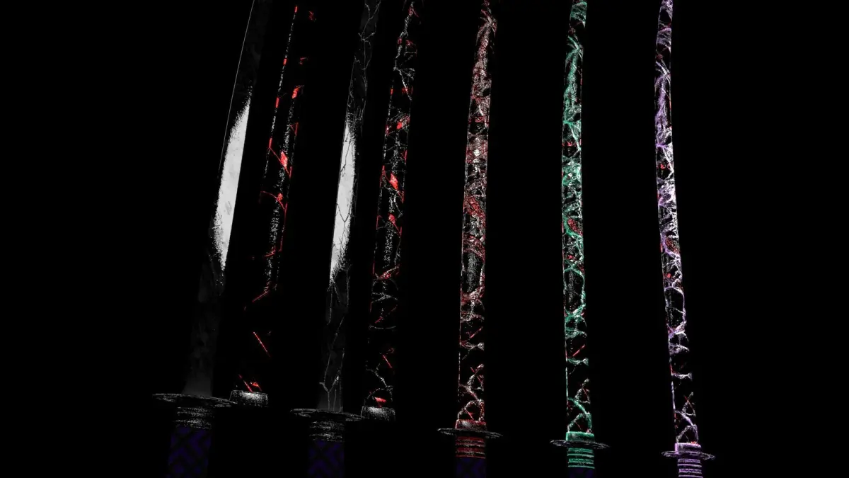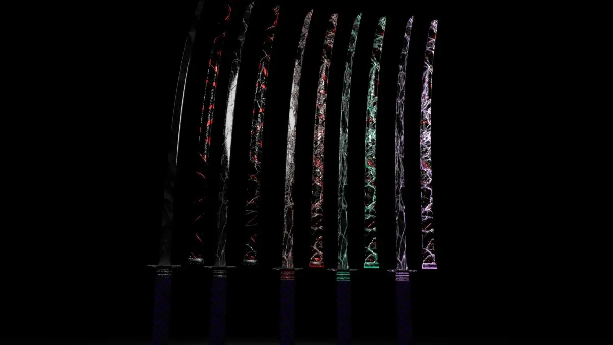 Three overloaded stages and one phase with no cracksNormal Katana Phase with no CracksCracked Katana Phase but no Emission YetLevel 1 Crackswith Emission Katana with Diferent Colors