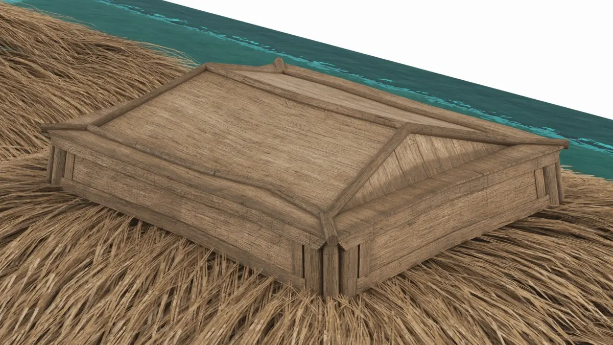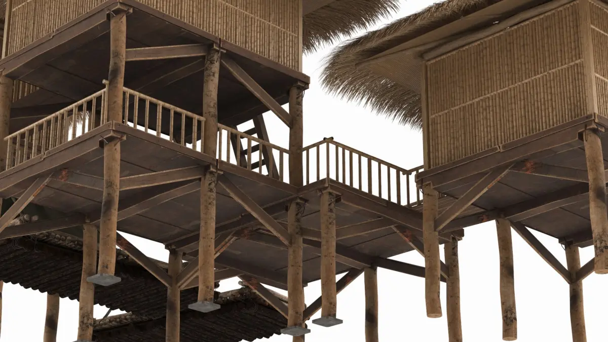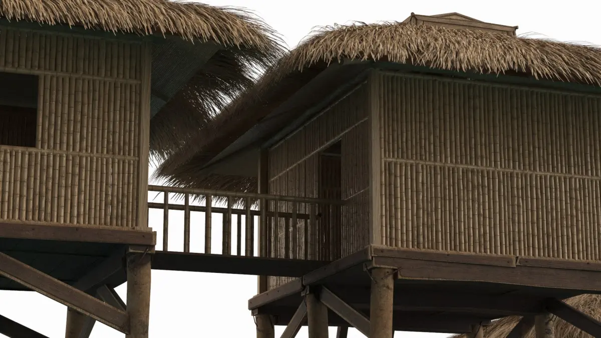 Overwater Bamboo Hut Complex with Decks and Raft is a three-dimensional model of thatched bamboo huts set which are traditional stilt houses, designed with natural materials like bamboo and thatch, exemplifying rustic living spaces.