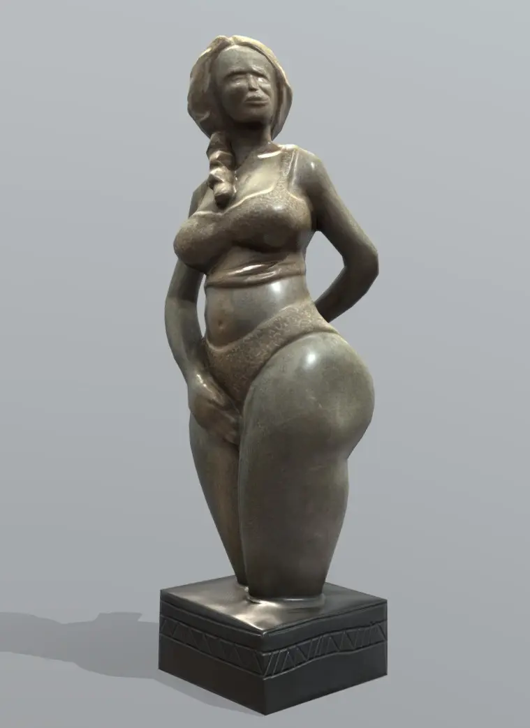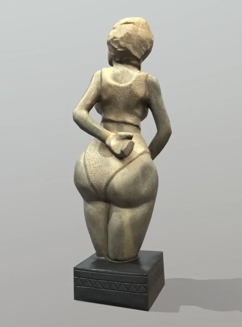 The stone sculpture depict a stylized female figure standing on a rectangular pedestal. The figure has a pronounced, curvaceous form with exaggerated hips and a detailed braid of hair falling over her shoulder. She is adorned in what looks like a textured bikini or undergarments, with intricate patterns etched into the stone. The pedestal is decorated with geometric patterns, adding to the overall artistic detailing of the piece. The figure's posture, with one hand on her hip and the other resting near her thigh, conveys a sense of confidence and poise.