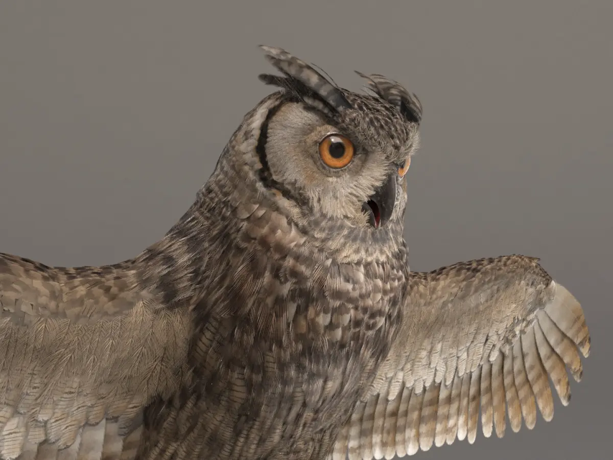 Owl model including feathers: 166096 polygons on 0 Subdivision level.