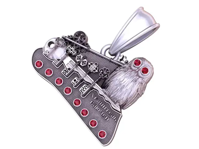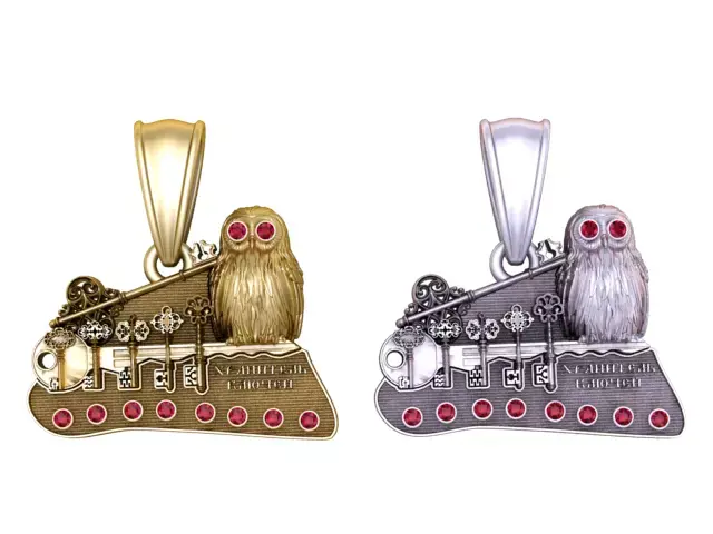 This intricate pendant is a masterpiece of symbolism and artistry. Crafted in radiant gold, it features a finely detailed owl with ruby-red gemstone eyes, representing wisdom and knowledge. Alongside the owl, a collection of ornate vintage-style keys rests elegantly, symbolizing secrets, opportunities, and the unlocking of destiny. The base is accented with a row of brilliant red gemstones, adding richness and balance to the design.
