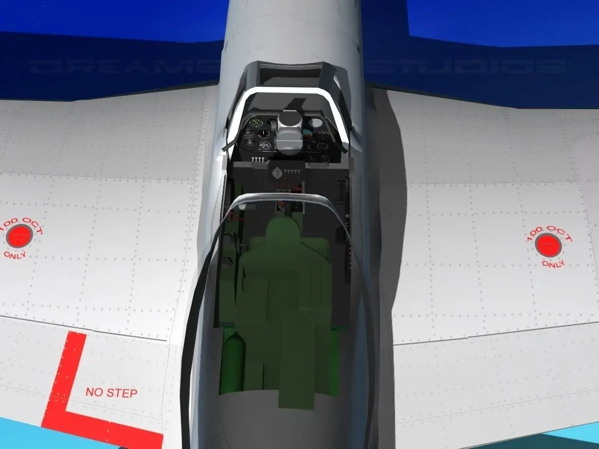 The later upgrade replaced many modeled parts, the textures for the wings and rebuilt the cockpit to include the additional details. Engine, oil reservoir, mounting arms, mounts, oil cleaner intake duct, fuel lines and spark plugs are also modeled. The cowling panels on either side can be removed to reveal the engine. These panels are just like what is found on the real Mustang allowing more realistic views of the aircraft undergoing maintenance. Landing gear features were added, spar, wing fuel tank are included in the wings. You see the rear fuel tank in the fuselage behind the seat. The Fuselage Fuel Tank is modeled as well as a nicely done set of electrical equipment and radios behind the pilots seat.