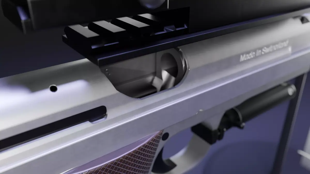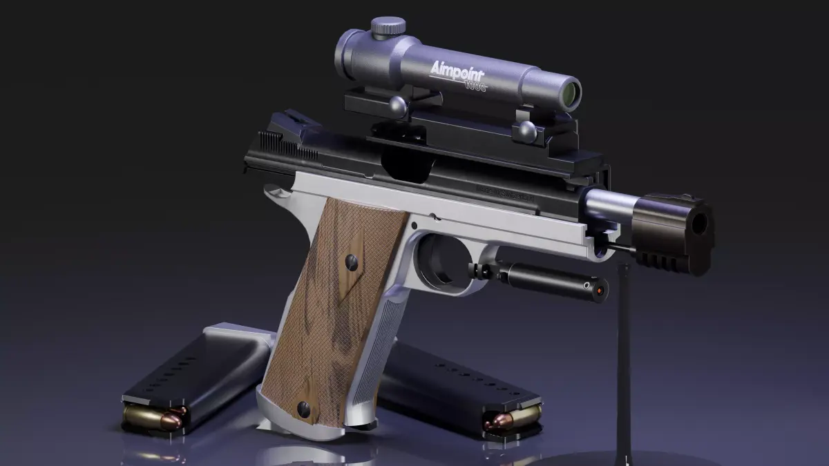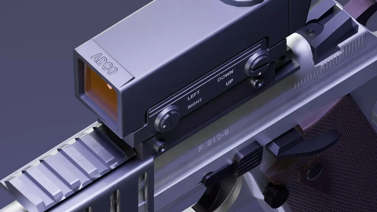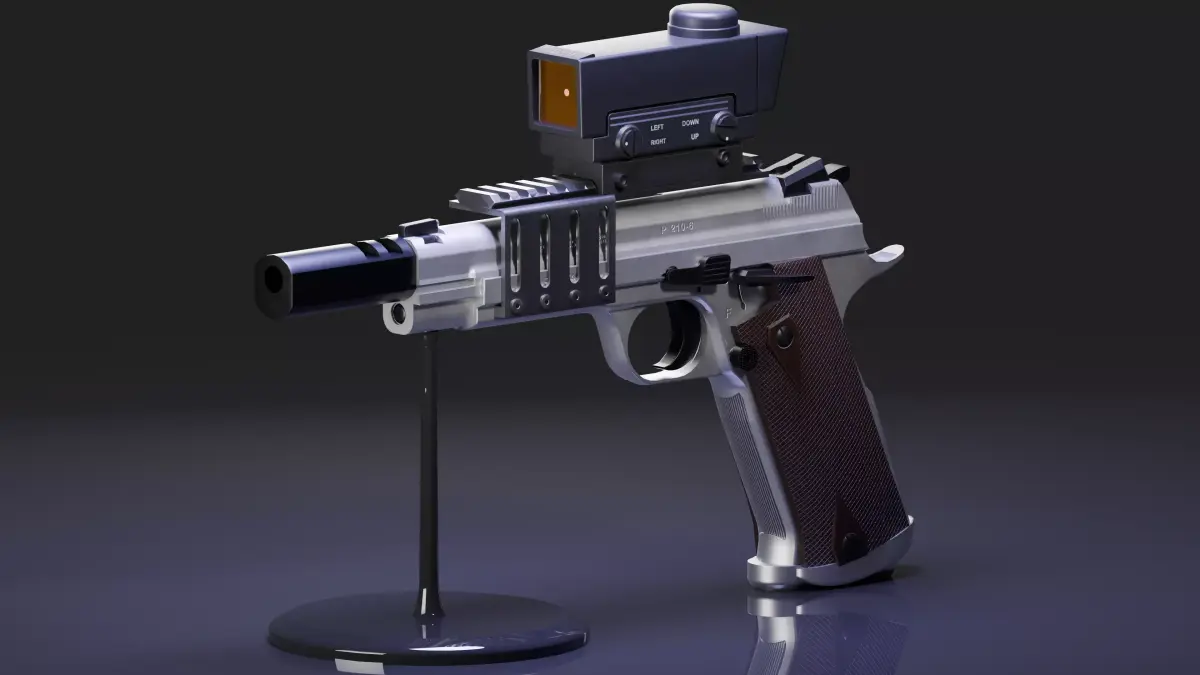 This particular model is based on the 7.65 Parabellum variants of the p210. It comes with two “race gun” inspired attachment sets. The first set contains a sight mount, an ADCO “square shooter” optic, and a fictional compensator. The second set includes a sight mount, Aimpoint 1000 + pic adapter, the P210-6 Heavy Frame Longslide Compensator, and finally, the NCstar red dot laser + universal pistol trigger mount.