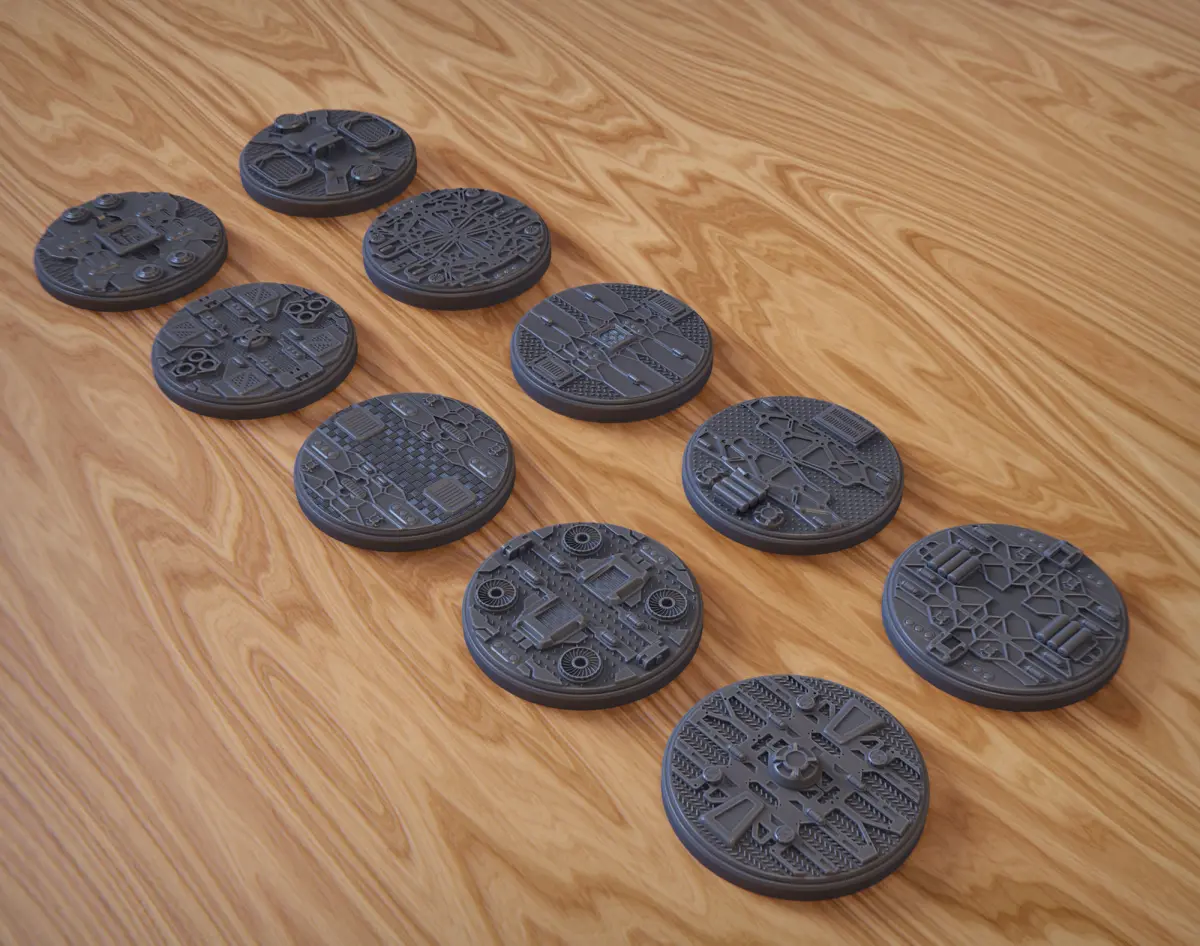 The pack includes 10 miniature bases 50 mm diameter 3dprint ready, in OBJ and STL format, put into 2 folders.The bases were made to represent scifi and industrial environments.