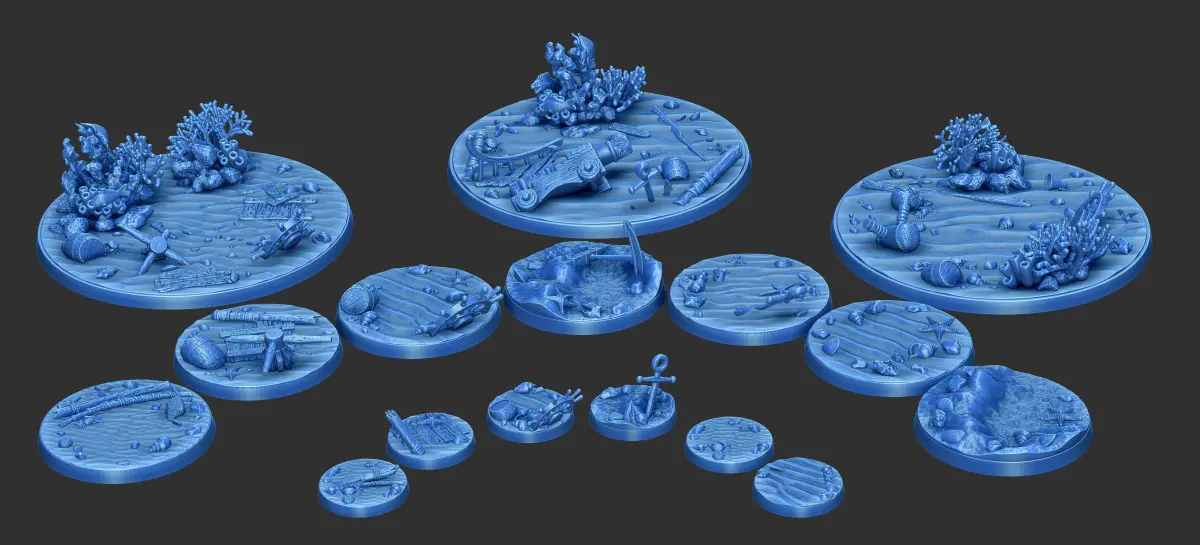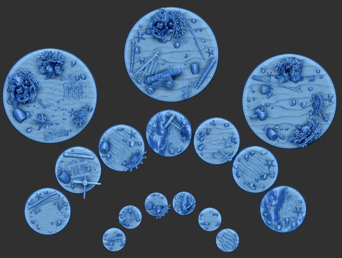The pack includes 16 miniature bases, specifically 6 of 25mm, 7 of 50mm and 3 of 100 mm diameter, 3dprint ready, in OBJ and STL format, put into 2 folders.