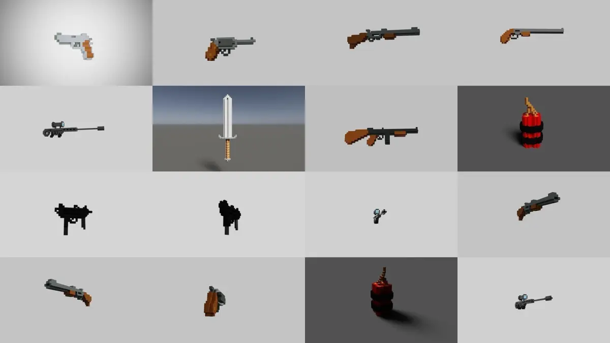 AKAXEBAZOOKABINOCULARSBOMBAMMUNITION BOXCANTEENFLAME THROWERGLOCKGRENADEKNIFEFLASHLIGHTM4MEDKITMINIGUNP90PISTOLREVOLVERPUMPSHOTGUNSNIPERSWORDTHOMPSONTNTUZI