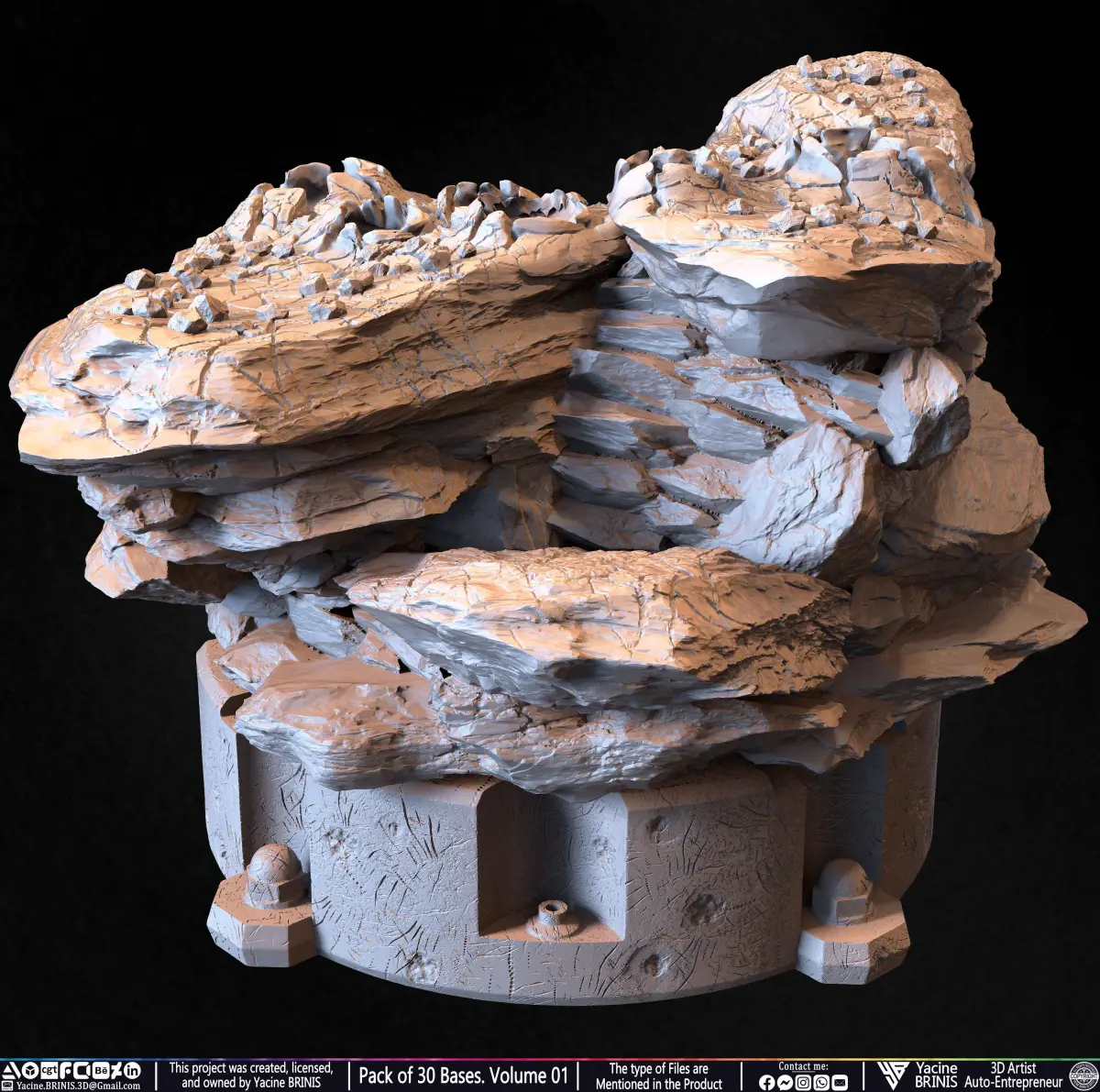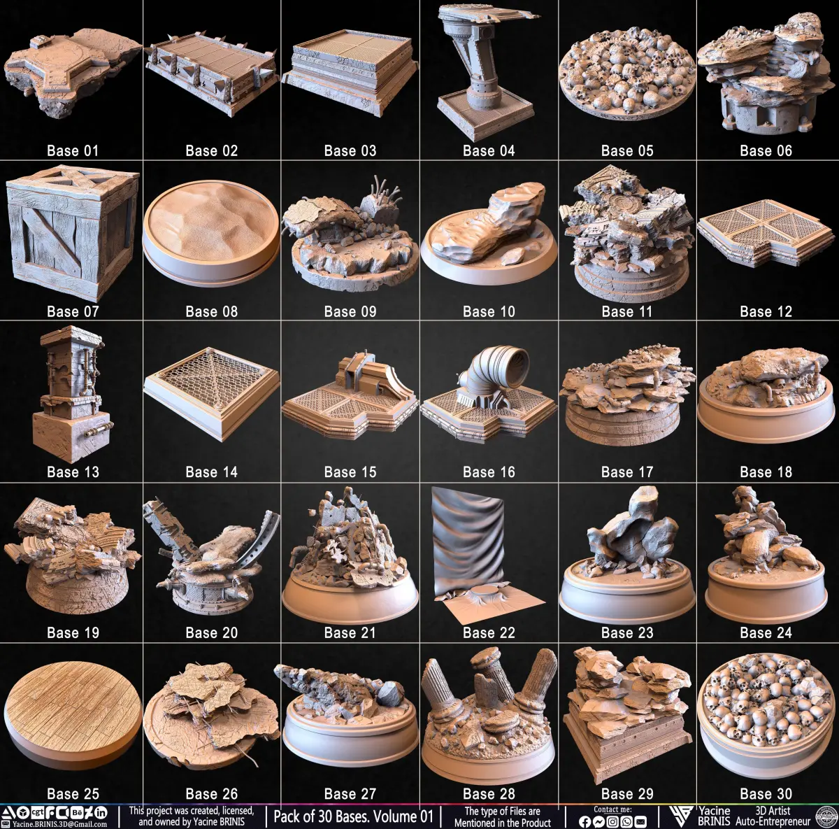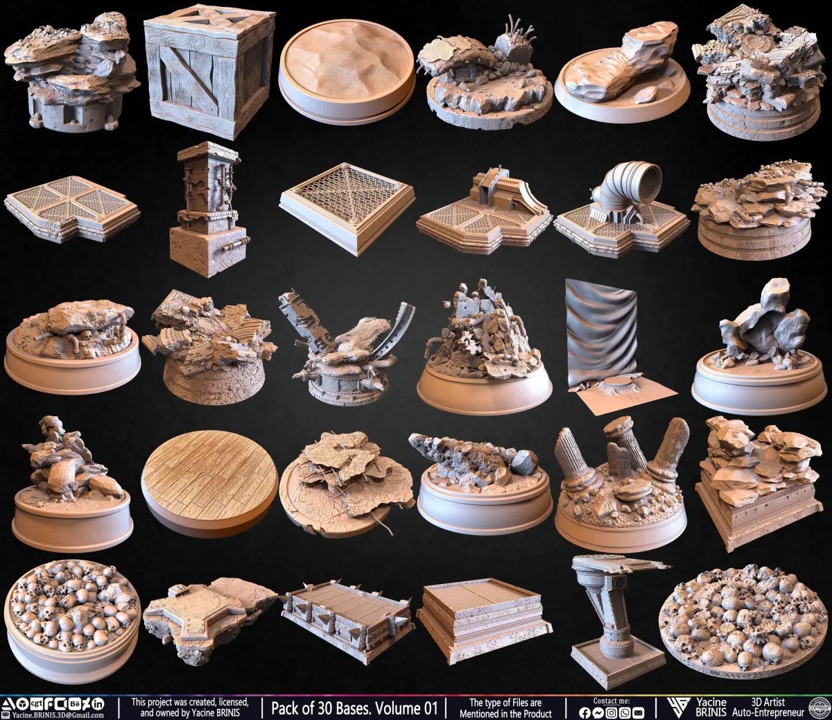 I am presenting a Pack of 30 Bases, sculpted in high resolution to serve as a foundation for characters, collectibles, dioramas, and display pieces. This diverse collection offers circular, square, and uniquely shaped bases, each meticulously detailed with varied terrains, structural elements, and environmental storytelling. Whether used for superheroes, villains, creatures, monsters, animals, vehicles, or fantasy characters, these bases enhance the realism and impact of any 3D project. The pack includes environments ranging from rocky wastelands and war-torn battlefields to eerie ruins and industrial settings, allowing for dynamic compositions and immersive storytelling.