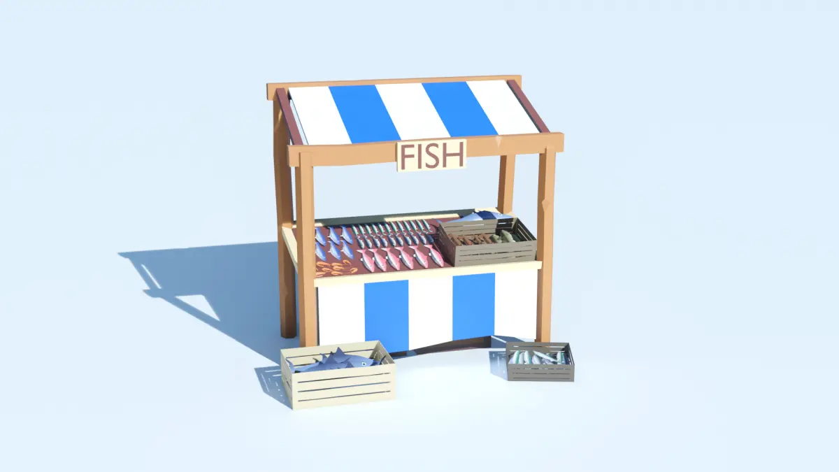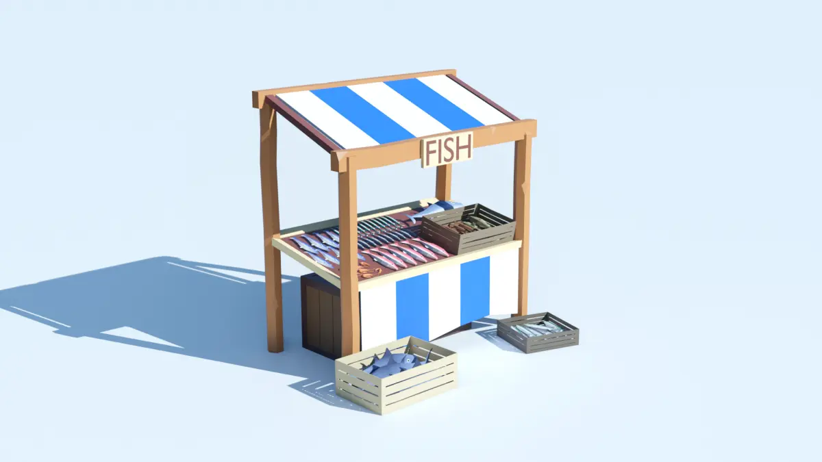 Low poly 3D model pack of a fish market stall, designed with procedural materials and no textures. It includes a variety of fresh fish displayed in crates and on shelves, perfect for port settings, medieval markets, or trade simulations. Its optimized design ensures efficient performance in video games and interactive environments.