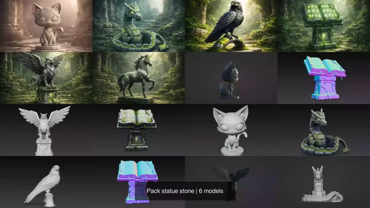 Stone Statue Pack – Stylized & Realistic Stone SculpturesThis Stone Statue Pack is a high-quality collection of stylized stone statues, designed for games, environments, ruins, temples, and fantasy or historical scenes. Each statue features detailed stone surfaces, subtle wear, and a timeless sculpted look that fits both realistic and stylized projects.The pack is perfect for level design, world-building, cinematics, and environment decoration. Models are optimized, clean, and easy to integrate into Blender, game engines, or rendering pipelines.Whether you’re creating an ancient temple, medieval ruins, fantasy world, or archaeological environment, this stone statue pack adds depth, atmosphere, and storytelling to your scene.
