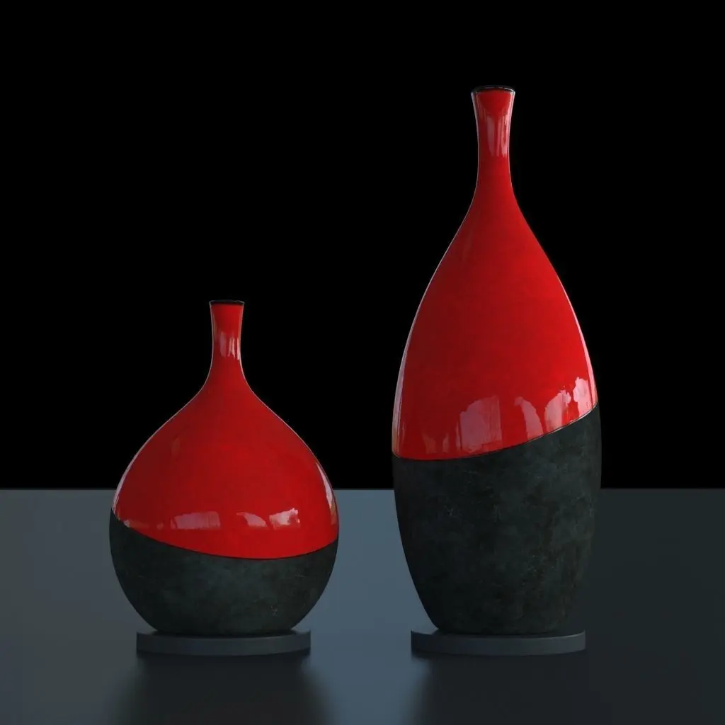 2 vases, Dark Concrete & Red Ceramic - 100 cm & 60 cm high.