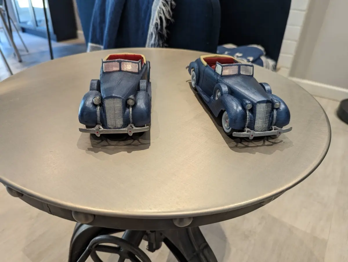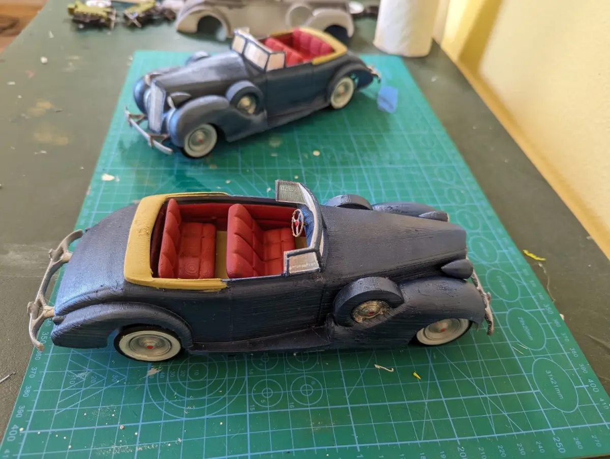 1938 Packard from blueprints and owners manual. Designed in blender. Took many tries. Painted with acrylics. Planning to do an engine. See images of the engine, but fit within shell not perfect yet. I printed windows and headlights with clear PLA.