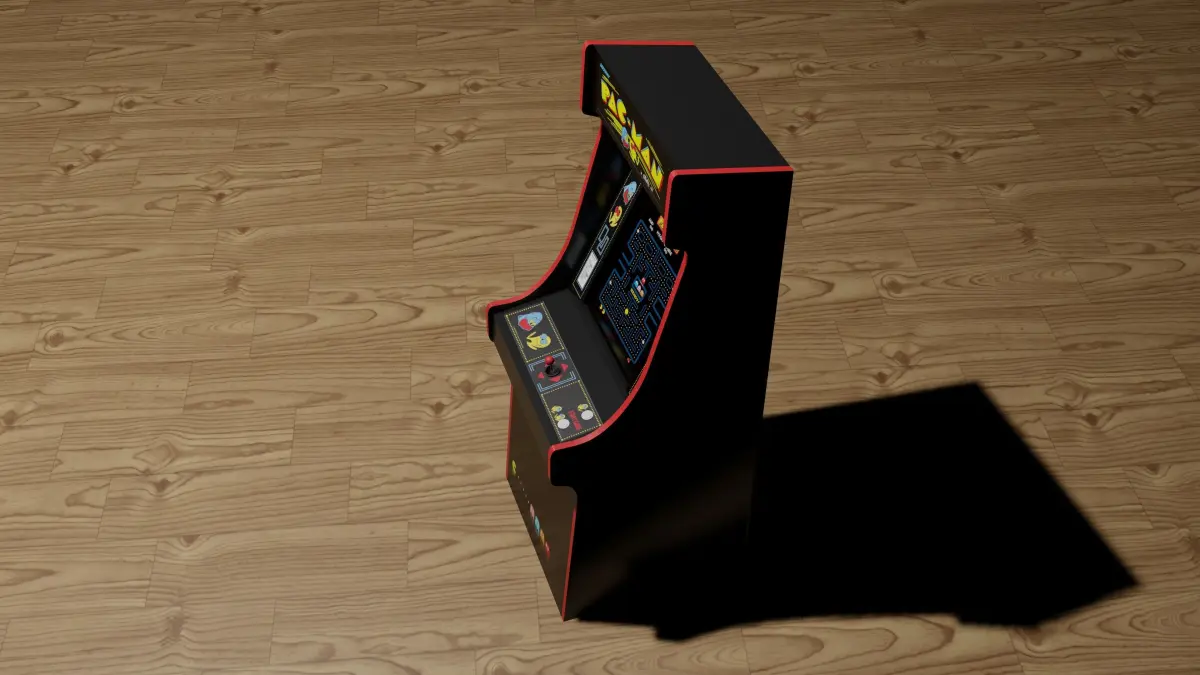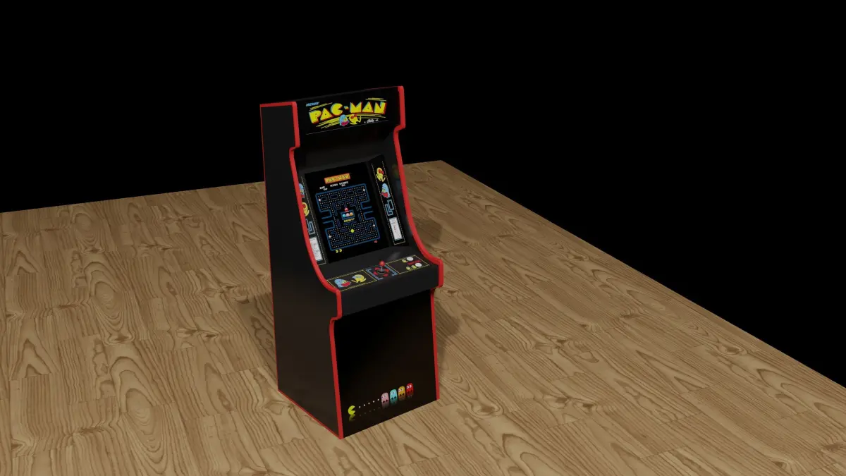 This is a lowpoly, custom pacman arcade machine. I combined classic logos with modern artsyle and created this model in blender. It has the original game as an image texture on a screen, a joystick and start buttons. The wooden floor is for display only.