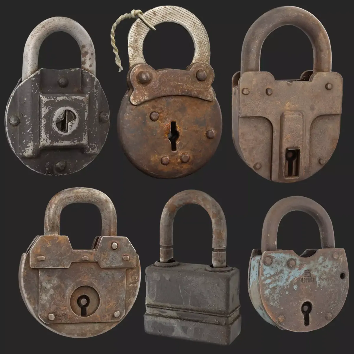 Hi-poly meshes:SM_Lock_1_HI.fbx (poly: 538944; vert: 269472);SM_Lock_2_HI.fbx (poly: 425484; vert: 212734);SM_Padlock_3_HI.fbx (poly: 923800; vert: 461900);SM_Padlock_4_HI.fbx (poly: 425484; vert: 212734);SM_Padlock_5_HI.fbx (poly: 235683; vert: 122272);SM_Padlock_6_HI.fbx (poly: 1099160; vert: 549580);