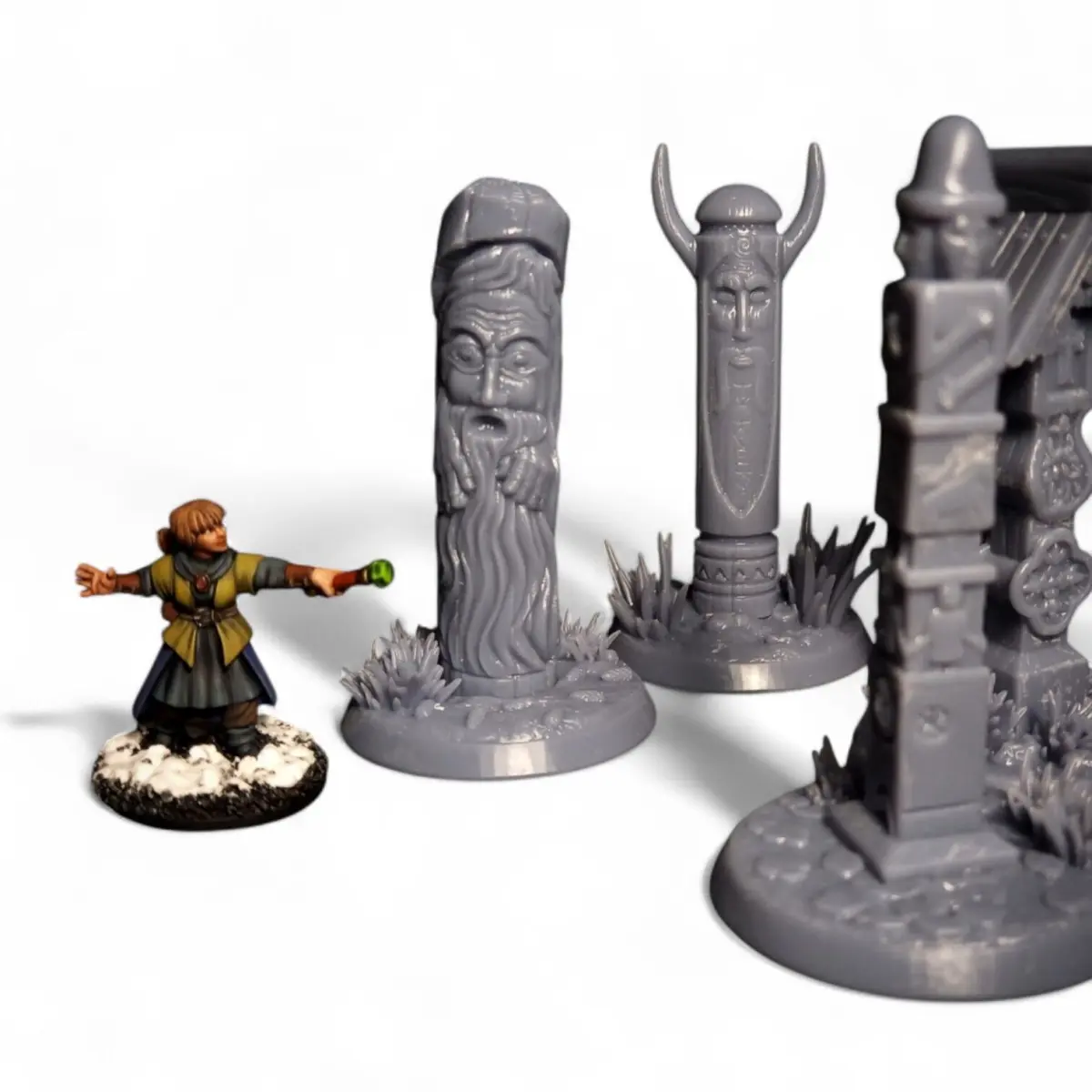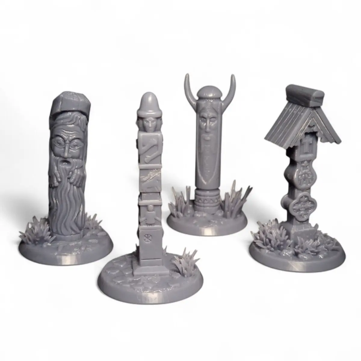 When darkness falls and whispers of ancient spirits fill the air, these eerie pagan idols awaken! Carved roughly from stone and aged wood, they stare silently at adventurers with mysterious, unsettling eyes.This set includes 10 unique idols, each with its own individual base — perfect for your tabletop adventures and dramatic scenes!