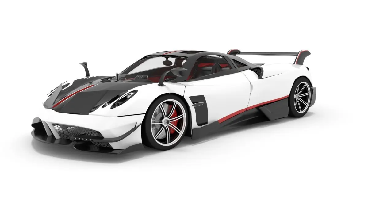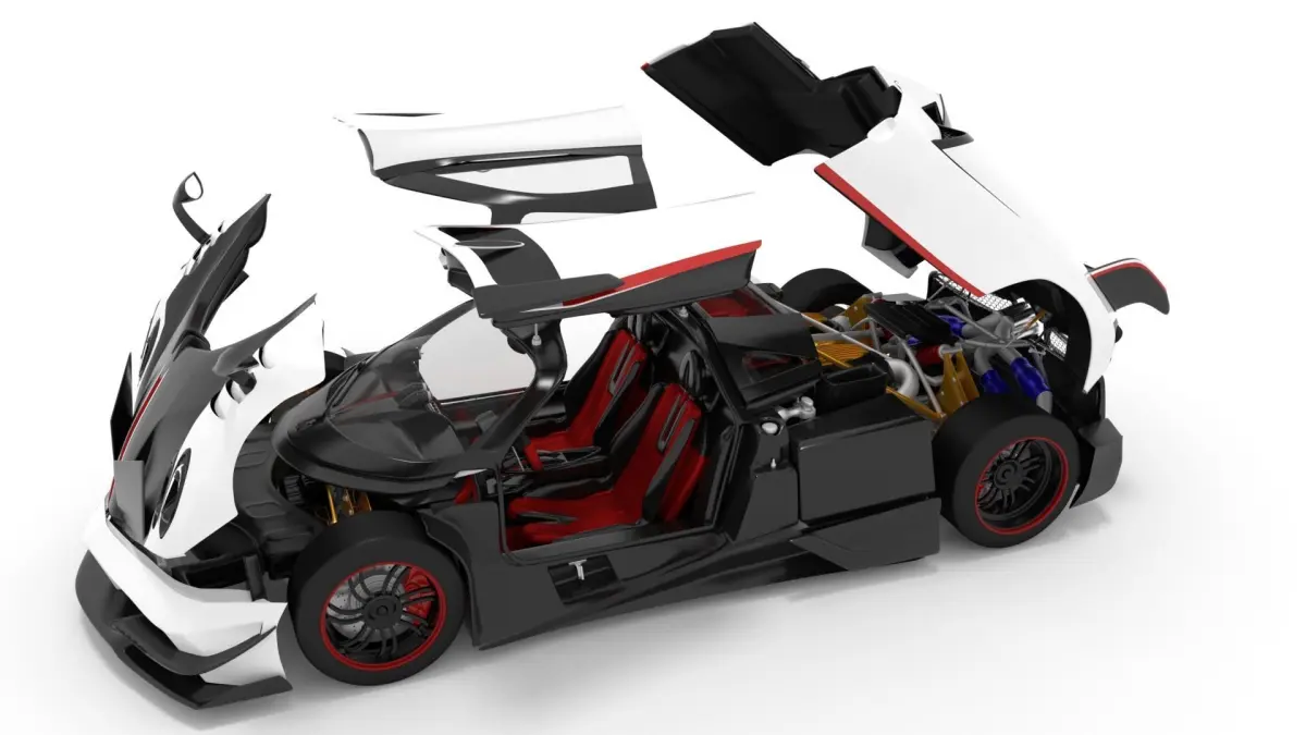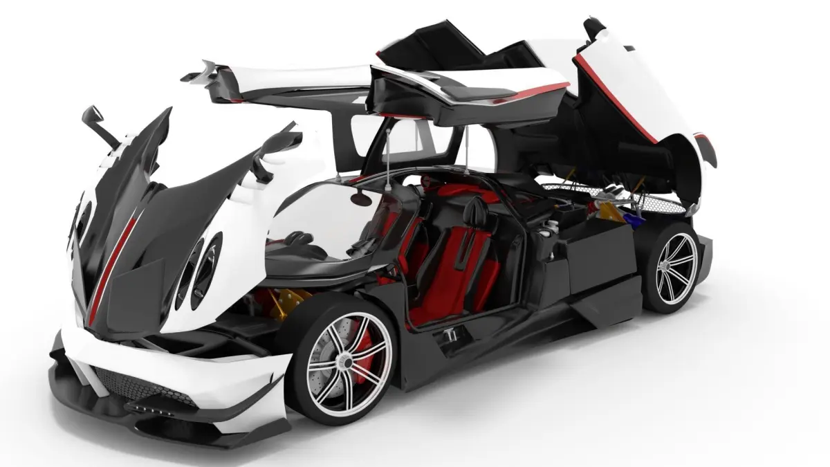including interiors, separate parts, engine details, and I added 2 rim options for additions, from the Huayra and Huayra BC rims, you can look for it in layers later if you use a blender. And animations are available for open doors and front covers, you can customize it.
