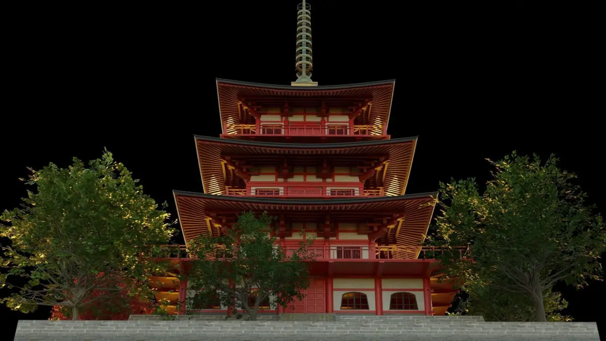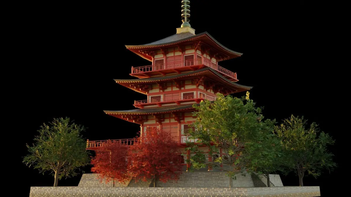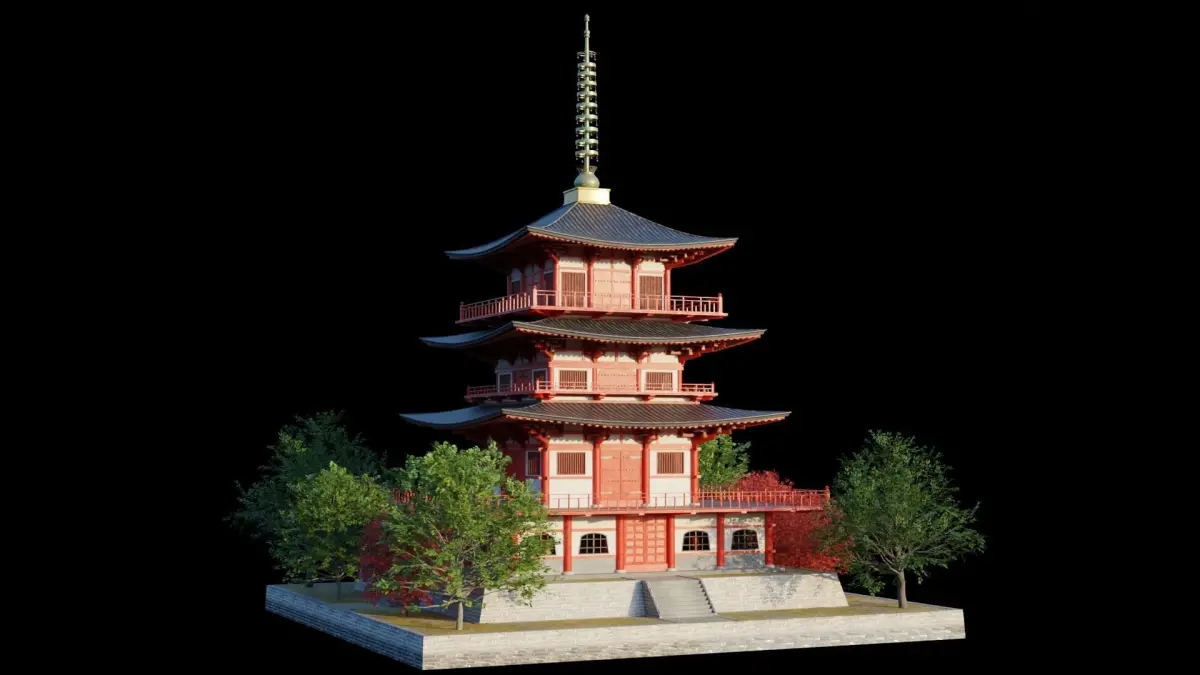 The pagoda is made of large eave style, referring to Japanese Green Shore Temple and Chinese Han-Tang Dynasty four-story pagoda style, 83M high (including base), 48M width and length (excluding base), all parts of the model can be moved, there is a simple internal structure, no internal stairs, made in Blender, Render with Cycles, scene contains plants.278611 vertices, 279651 quadrangular faces, 548379 triangular faces, opening the model requires 7G running memory.Important Note: Unable to select a file format due to Internet reasons, this product only offers Blender file format.
