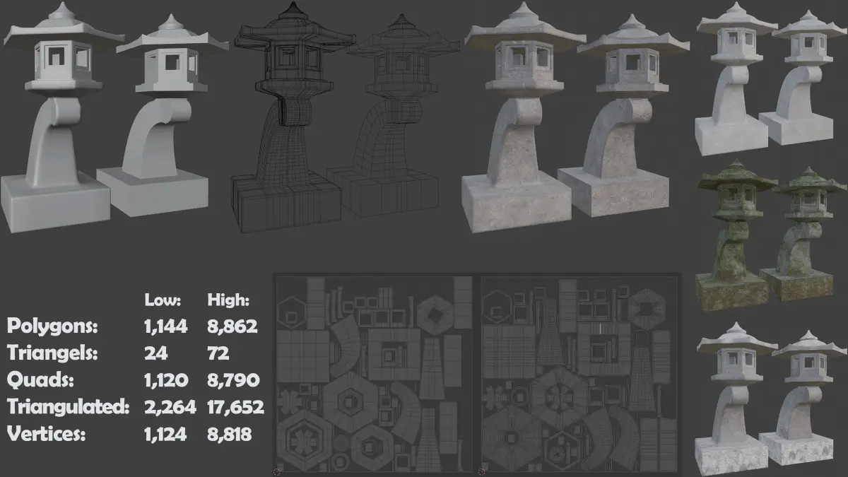 Pagoda Stone Statue with high-poly and low-poly version mesh.