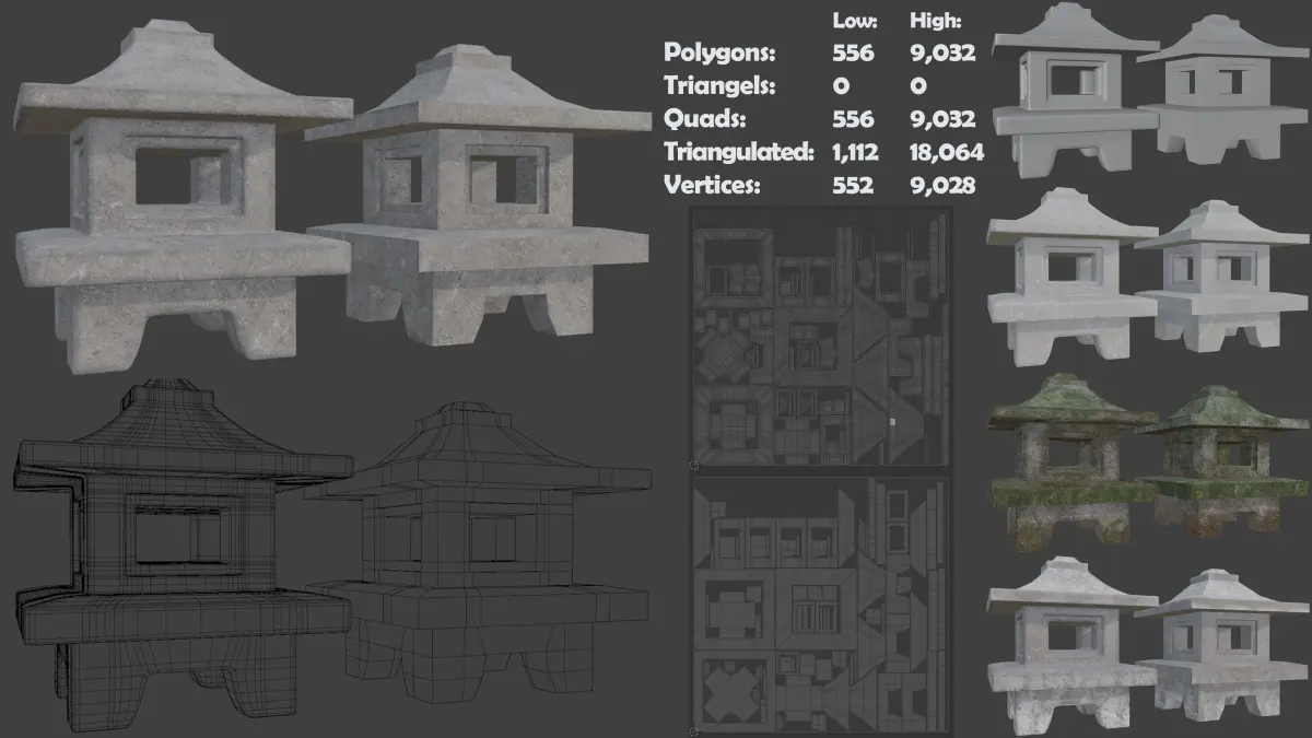 Pagoda Stone Statue with high-poly and low-poly version mesh.