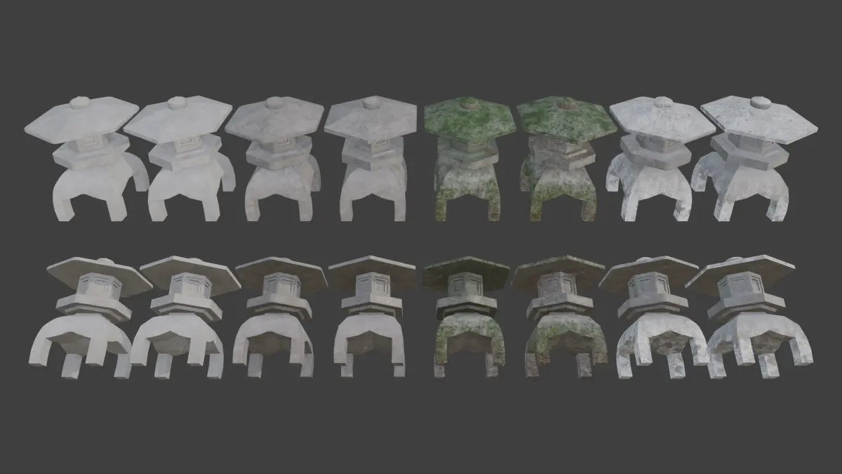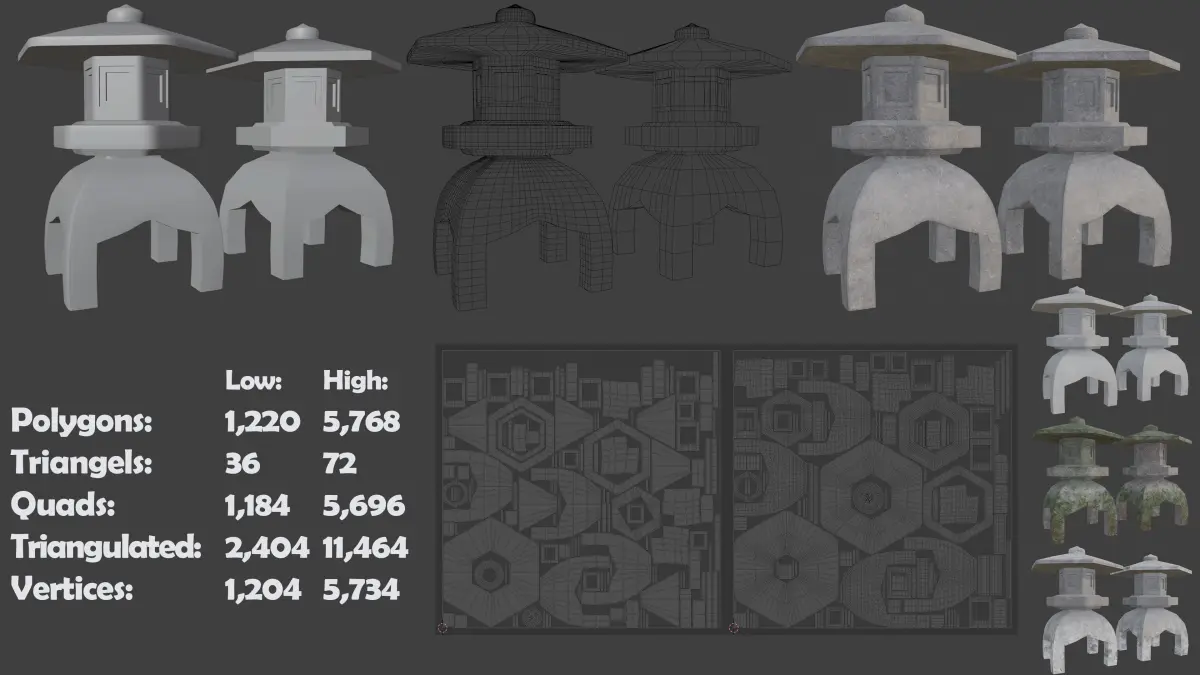 Pagoda Stone Statue with high-poly and low-poly version mesh.