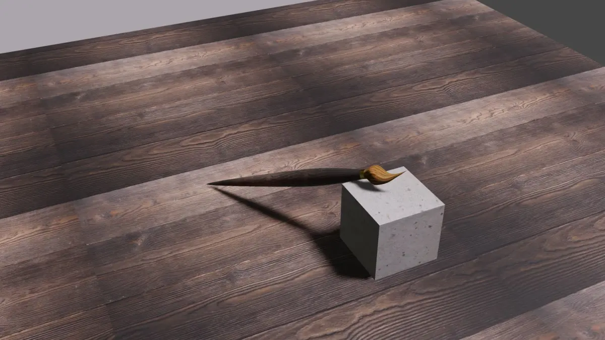 A 3D modelled paint brush made in Blender 2.8- different points off camera view- realistic looking paint brush on wooden floor-