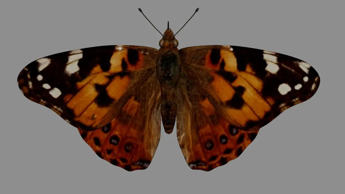 Scale model of a Painted Lady, indigenous to North Africa, the Middle East, and central Asia, Europe, Britain and Ireland. This model is created according to the anatomy of the Painted Lady, which is part of a family of butterflies known as the brush-foot butterflies (Nymphalidae). These butterflies have only 4 useable legs, with the two front legs much smaller and attached close to the thorax.