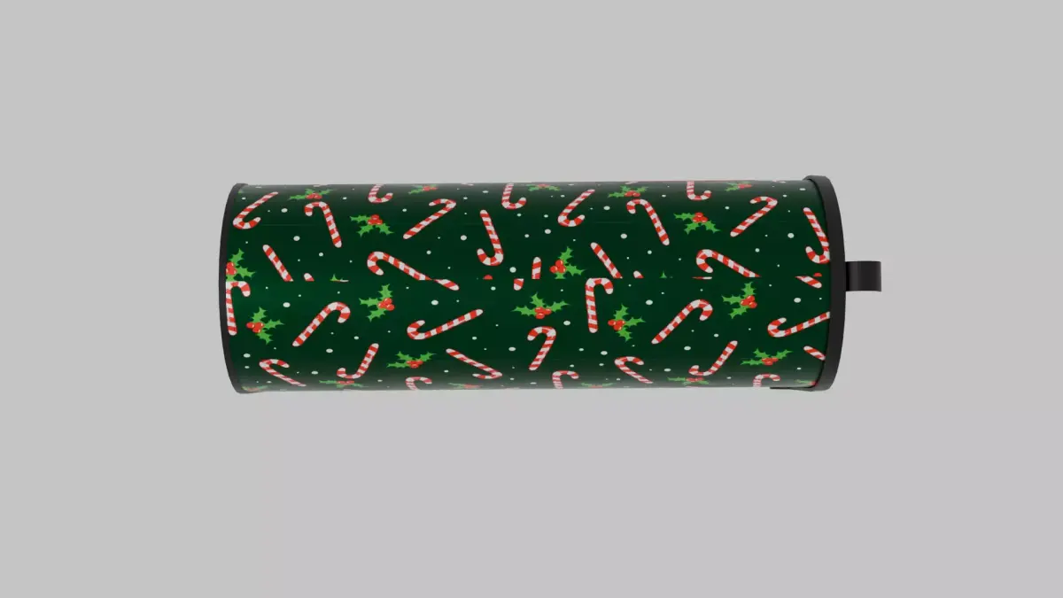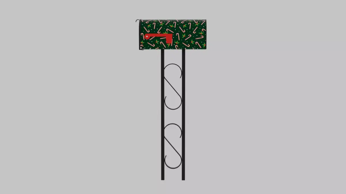 This model features a festive Christmas-themed mailbox covered in a cheerful wrapping paper design. The mailbox itself is a standard black metal box, sturdy and classic, with the front door kept solid black for a clean, functional look. The top and side panels are completely wrapped in a vibrant green pattern adorned with candy canes and holly leaves, evoking a playful holiday spirit. The candy canes are bright red and white, while the holly leaves are deep green with small red berries, creating a lively, eye-catching contrast against the green background. The decorative post remains the same simple metal scrollwork, providing stable support while letting the festive artwork take center stage. This mailbox brings a joyful, holiday-ready accent to any yard or driveway.