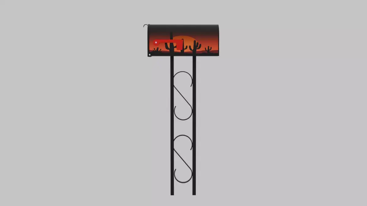 This model features a painted mailbox with a desert sunset design on each side. The mailbox itself is a standard black metal box, sturdy and classic, with the front door kept solid black for a clean, functional appearance. The side panels showcase a vibrant desert scene, painted in deep oranges, warm yellows, and rich blacks to capture the glow of a setting sun. Stylized cactuses rise from the sandy horizon, creating depth and atmosphere, while subtle gradients mimic the fading light across the sky. The artwork wraps the sides naturally without overwhelming the mailbox’s form. Mounted on a simple metal scrollwork post, this piece brings a warm, southwestern flair to any yard or driveway, combining practical use with artistic charm.
