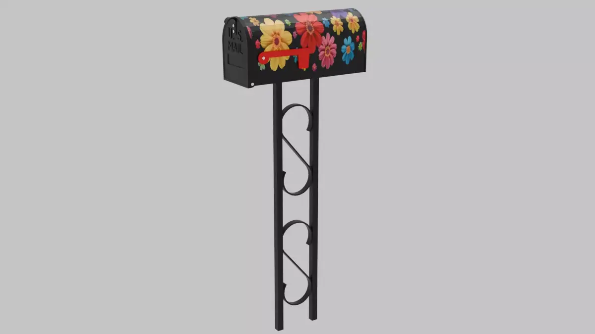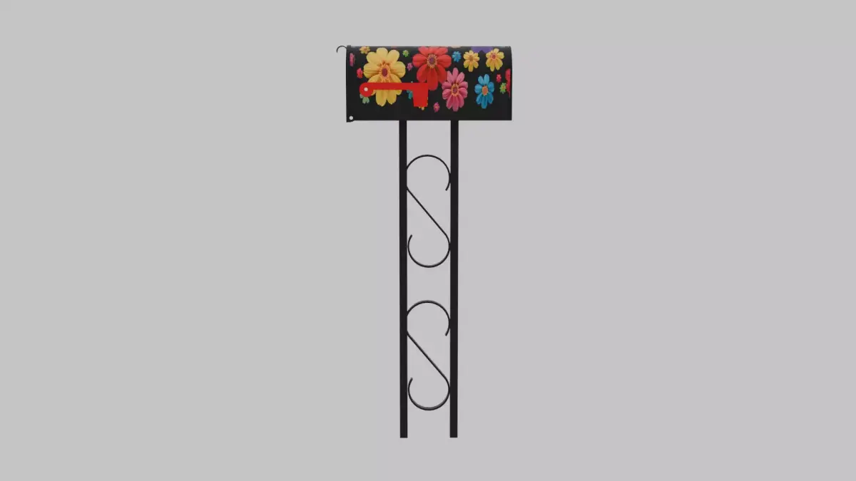 This model features a painted mailbox covered in bright, colorful flowers. The base is a standard black metal mailbox, sturdy and classic in shape, with the front door remaining solid black to maintain a clean, functional look. Unlike simpler designs, the top and side panels are completely adorned with hand-painted blooms in a variety of vibrant colors—reds, yellows, pinks, blues, and purples—creating a cheerful, eye-catching pattern. The decorative post remains the same simple metal scrollwork style, providing stable support while allowing the vivid floral artwork to be the main focus. This mailbox brings a joyful, artistic touch to any yard.