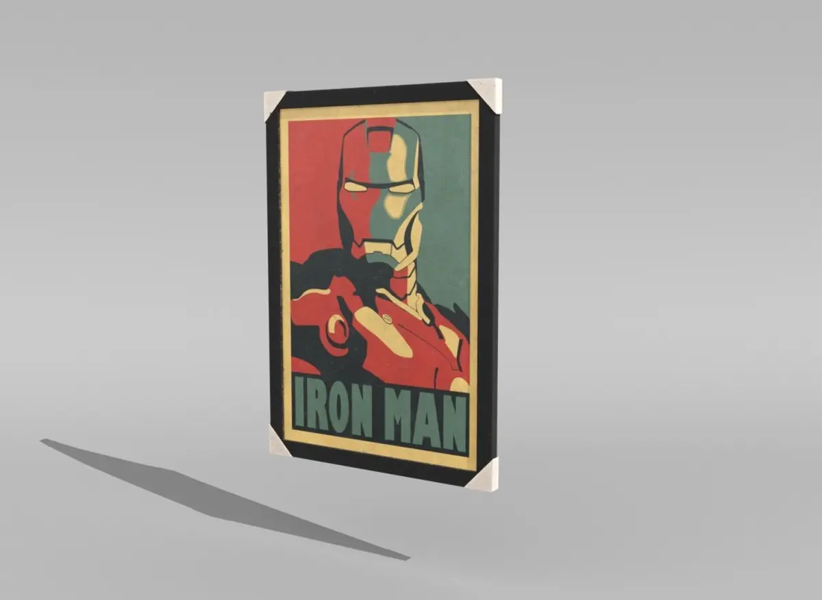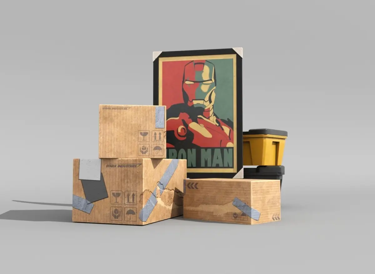 High-quality realistic 3d model of cardboard boxes and a painting portrait.