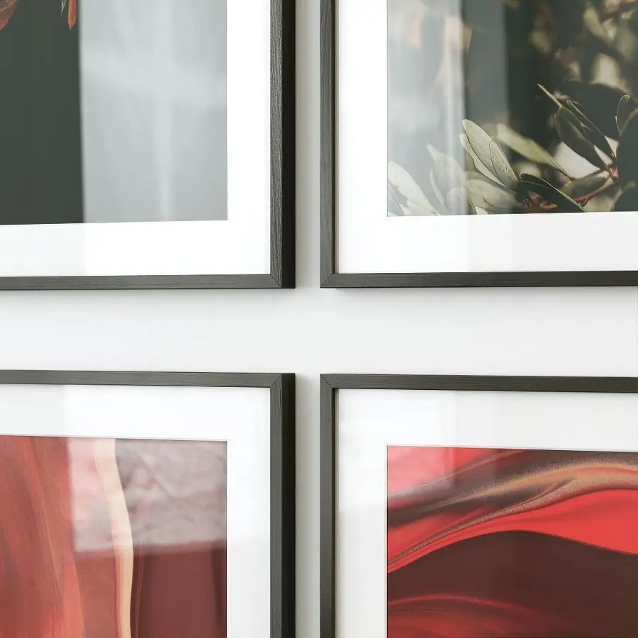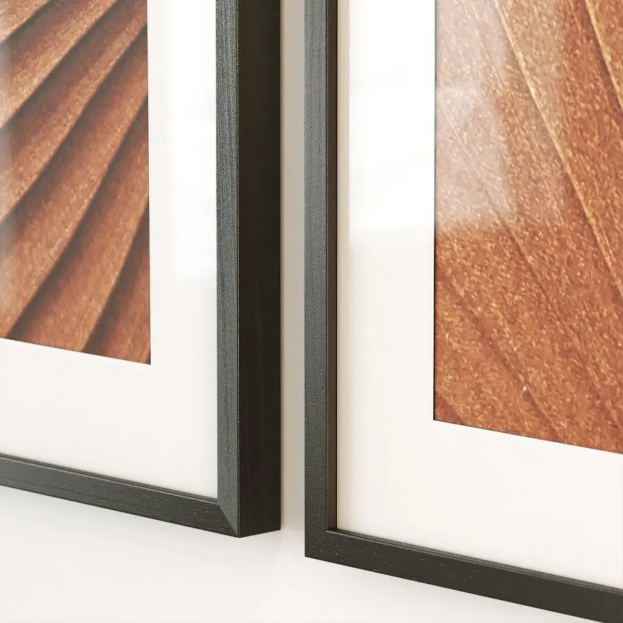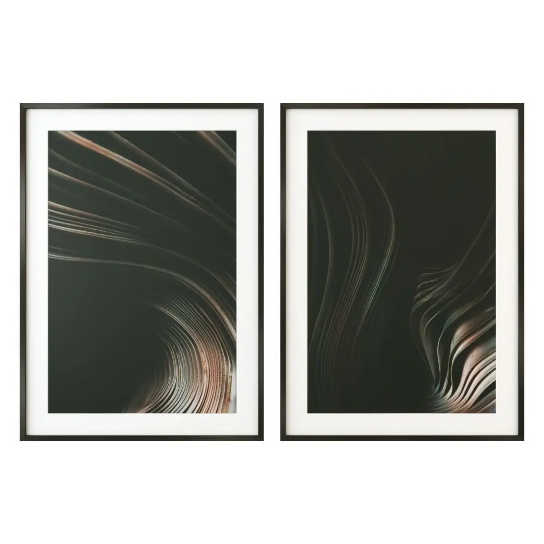 Set of six pairs of posters in black wooden frames.