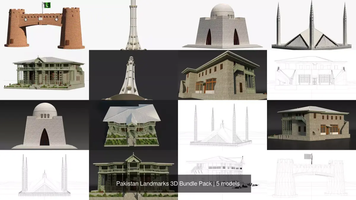 This Pakistan Landmark 3D Model Bundle features five iconic architectural structures representing the cultural and historical identity of the nation. It includes high-quality models of Quaid-e-Azam's Tomb (Mazar-e-Quaid), Faisal Masjid, Minar-e-Pakistan, Bab-e-Khyber, and Ziarat Residency. Each model is crafted with attention to detail, reflecting the original architecture and aesthetic significance. Ideal for educational visuals, patriotic projects, urban design, and 3D scenes with a national theme. Whether you're showcasing heritage or building realistic cityscapes, this bundle adds timeless Pakistani essence to your work.